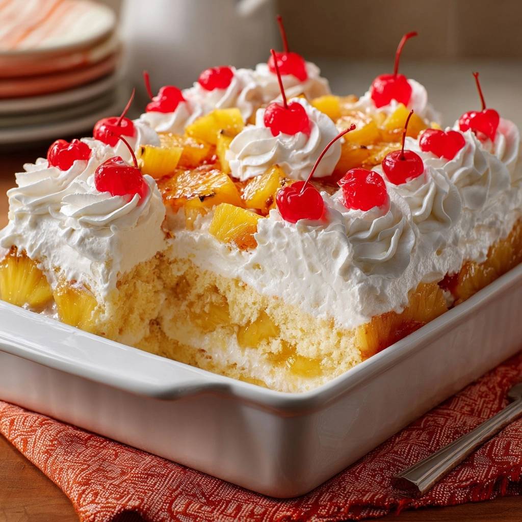 - Mit Ananasringen und Kirschen dekorieren. Mindestens 3 Stunden (besser über Nacht) im Kühlschrank fest werden lassen. In Stücke schneiden und genießen – immer saftig, nie matschig!