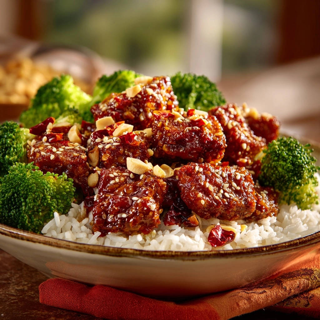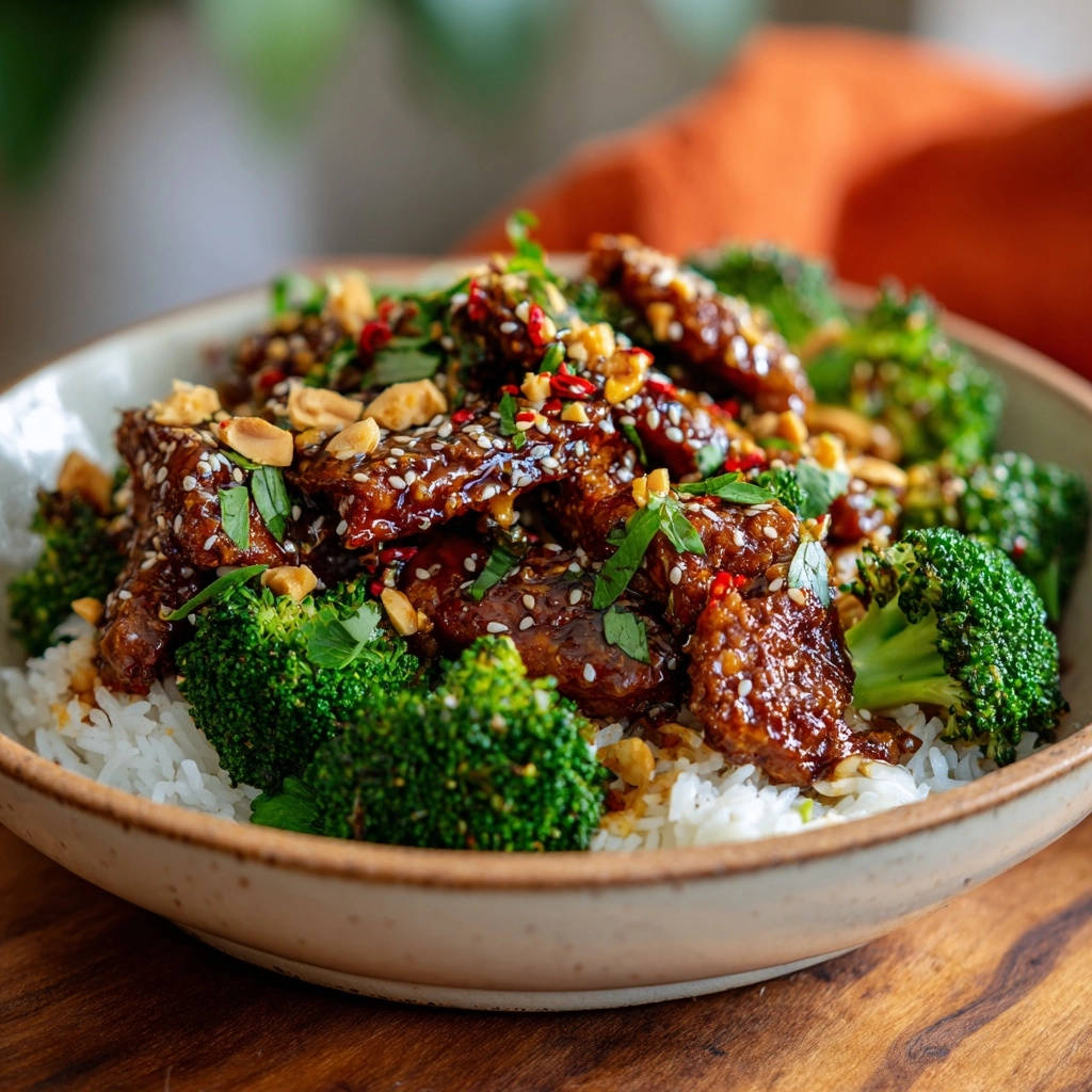 - Anrichten: Den gekochten Reis in Schüsseln verteilen. Die glasierten Rindfleischstreifen und den blanchierten Brokkoli darüber anrichten. Großzügig mit gehackten Erdnüssen, Sesam und frischen Korianderblättern oder Petersilie garnieren. Sofort servieren und genießen!