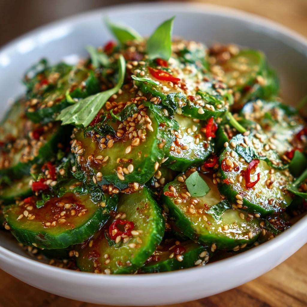 Dieser asiatische Gurkensalat besticht durch seine knackige Textur und das tiefrote, würzige Dressing. Durch das konsequente Entwässern der Gurken mittels Osmose verhinderst du, dass der Salat verwässert. Die Kombination aus Sojasauce, Reisessig und geröstetem Sesamöl sorgt für ein authentisches Geschmackserlebnis, das durch frische Chilis und Kräuter perfekt abgerundet wird.