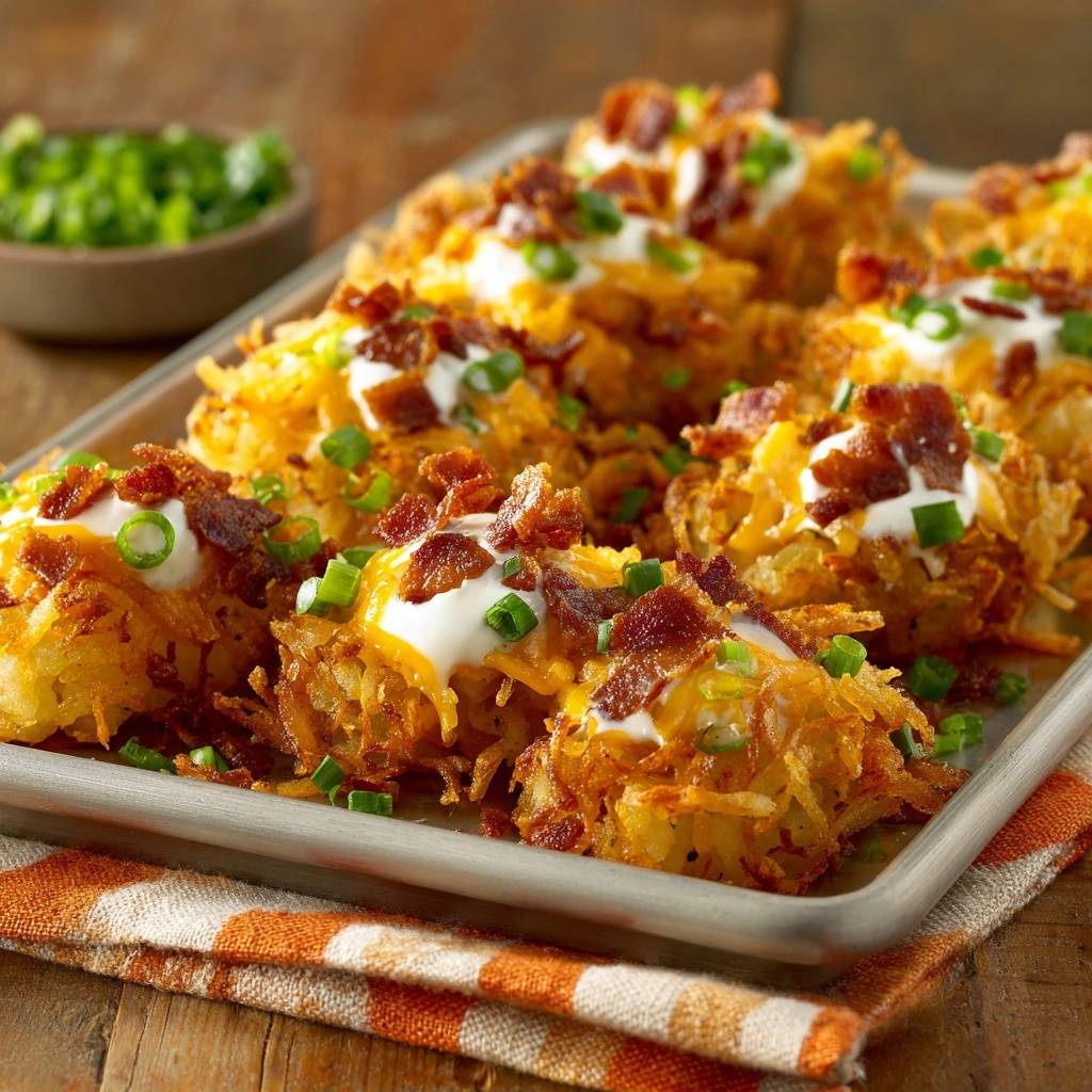 Der erste Biss in diese beladenen knusprigen Kartoffelnuggets ist pure Freude. Außen knackig goldbraun, innen weich und saftig, dann der Schmelzkäse, cremige saure Sahne und frische Frühlingszwiebeln. Dazu knusprige Räuchertofu-Streifen für diesen rauchigen Kick. Du spürst sofort, warum das dein neues Lieblingsrezept wird.