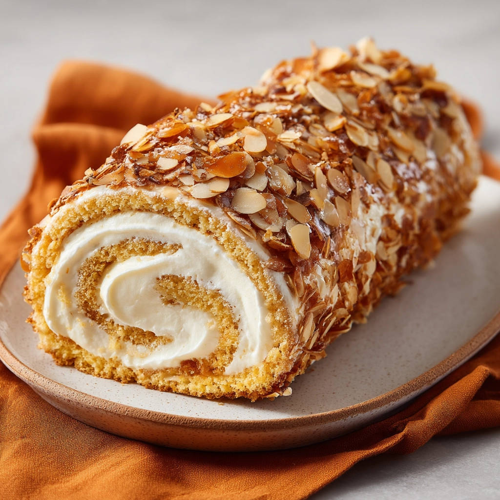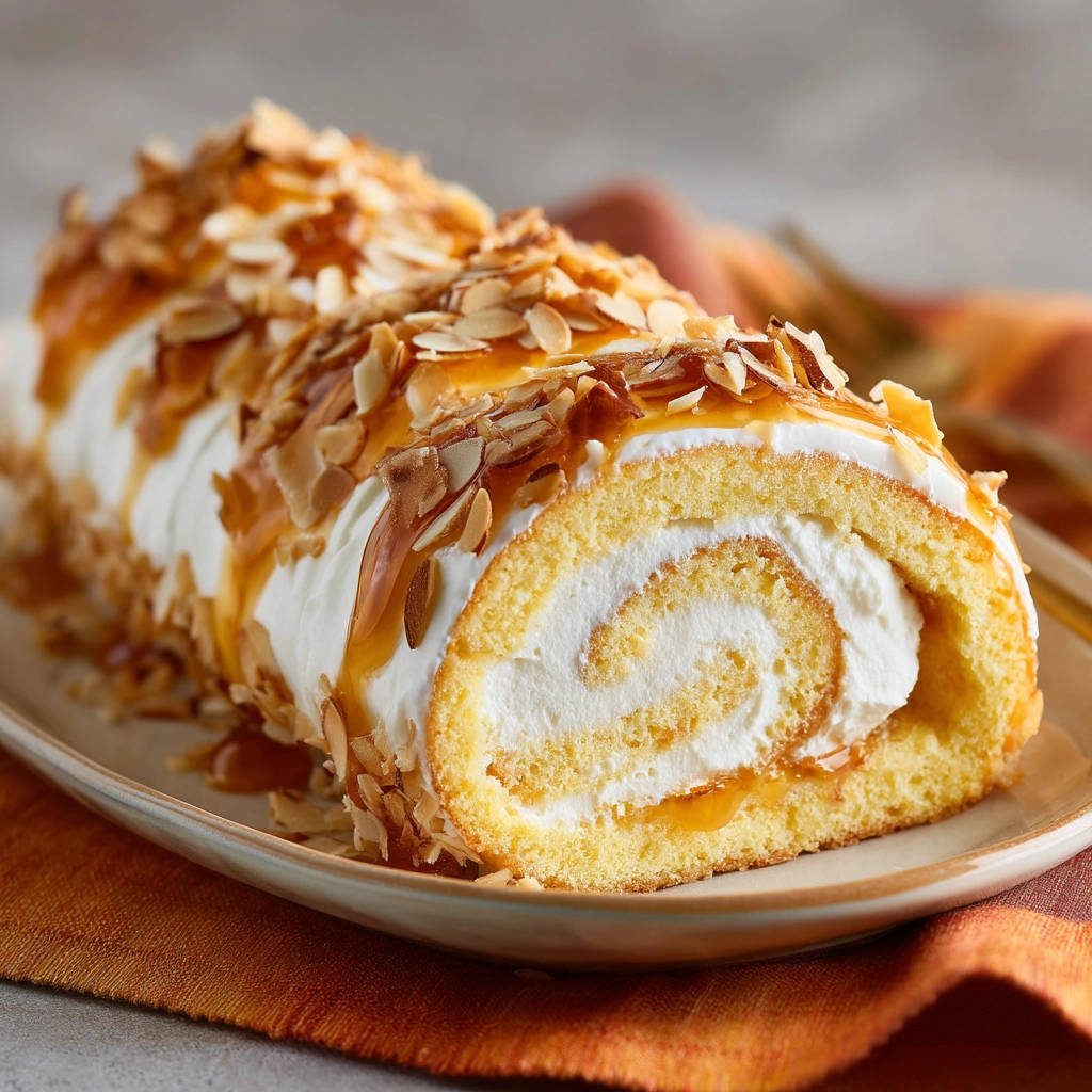 - Fertigstellen und kühlen: Lege die fertige Biskuitrolle auf eine passende Servierplatte. Beträufle sie großzügig mit Karamellsauce und bestreue sie mit gehobelten Mandeln. Stelle die Rolle vor dem Servieren mindestens 30-60 Minuten kalt. So kann die Füllung fest werden und die Aromen verbinden sich.