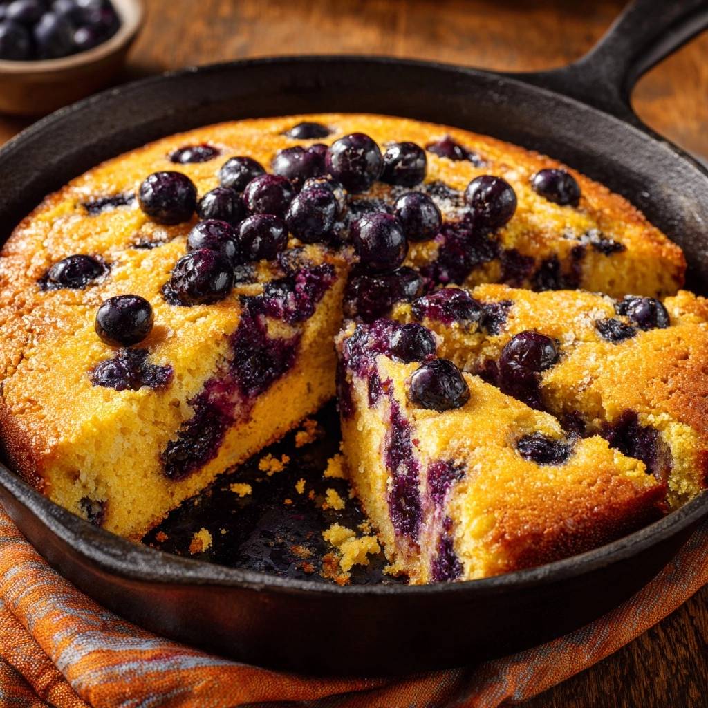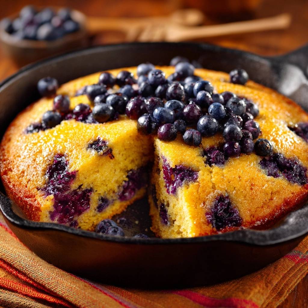 Stell dir vor, du nimmst den ersten Bissen von diesem Blaubeer-Cornbread aus der Gusseisenpfanne. Die Kruste knackt leicht, innen explodiert Saftigkeit mit knackigen Beeren, die genau da sitzen, wo sie hingehören. Kein Matsch unten, nur purer Genuss.
