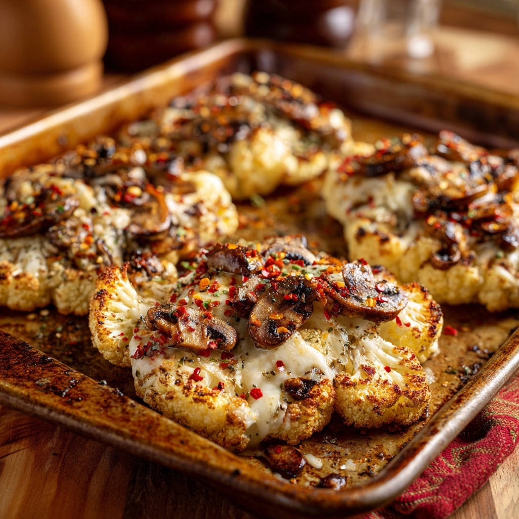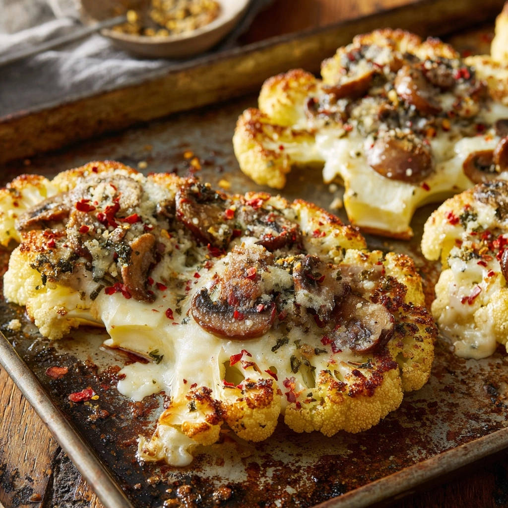 - Gratinieren und Genießen: Verteile die angebratenen Champignons gleichmäßig auf den Blumenkohl-Steaks. Bestreue alles großzügig mit dem geriebenen Mozzarella und dann mit dem geriebenen Hartkäse. Falls gewünscht, streue noch ein paar Chiliflocken darüber. Schiebe das Blech in den vorgeheizten Ofen und backe die Blumenkohl-Steaks für weitere 15-20 Minuten, oder bis der Käse goldbraun und blasig ist und der Blumenkohl perfekt zart ist. Lass sie vor dem Servieren kurz ruhen.