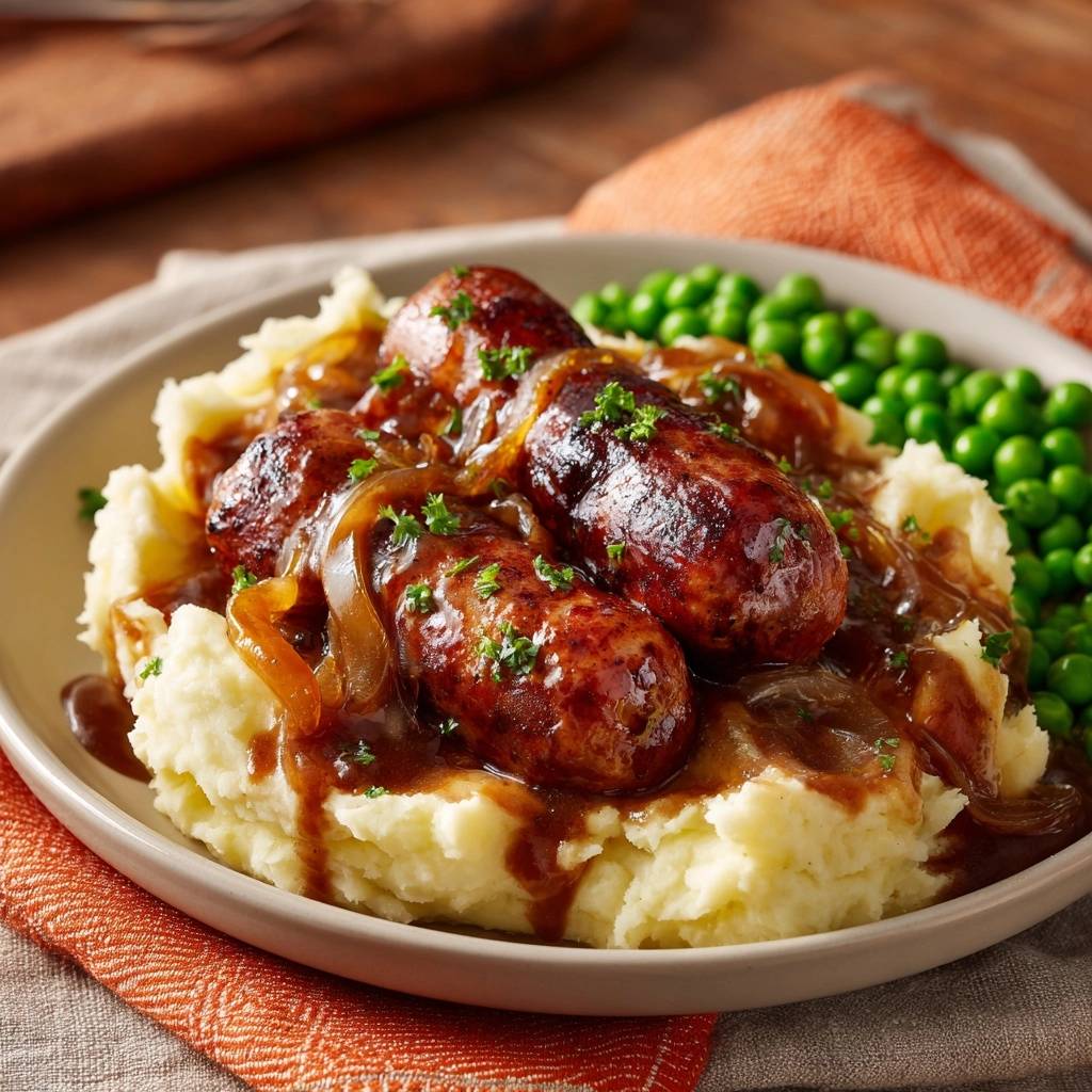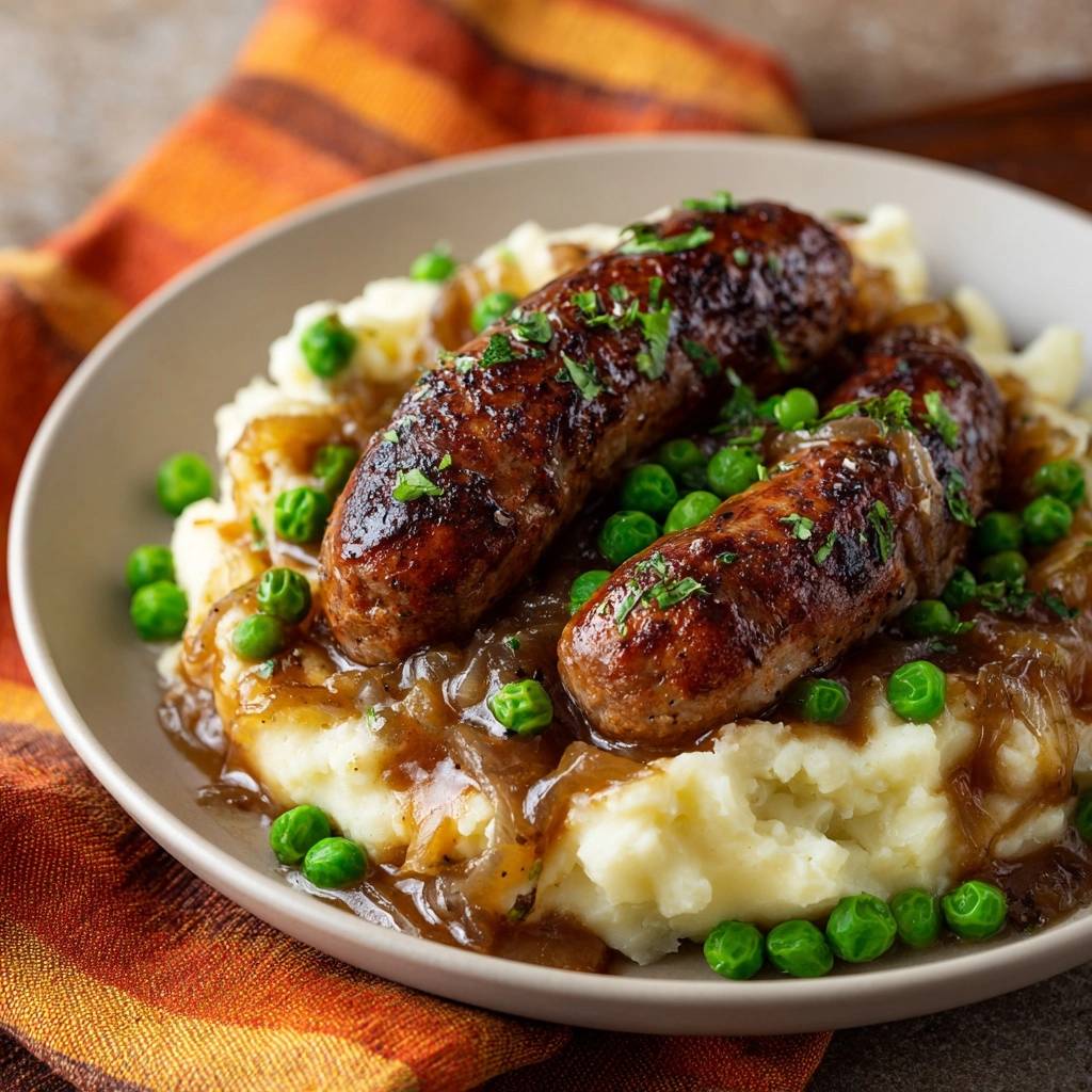 Der Duft von goldbraun gebratenen Bratwürsten zieht durch die Küche, und der erste Bissen? Saftig, knackig, mit einer Kruste, die perfekt abbricht. Dazu cremiger Kartoffelbrei, der sich schmilzt, frische Erbsen, die knacken, und eine Zwiebelsoße, die alles umhüllt. Das ist pure Hausmannskost, die dich umarmt.