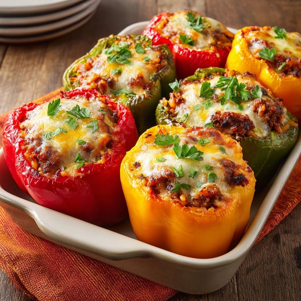 Der erste Bissen in eine bunte gefüllte Paprika explodiert im Mund. Saftiges Hackfleisch mischt sich mit fluffigem Reis, umhüllt von schmelzendem Käse. Der Duft von frischer Petersilie und gebratenem Fleisch zieht durch die Küche.
