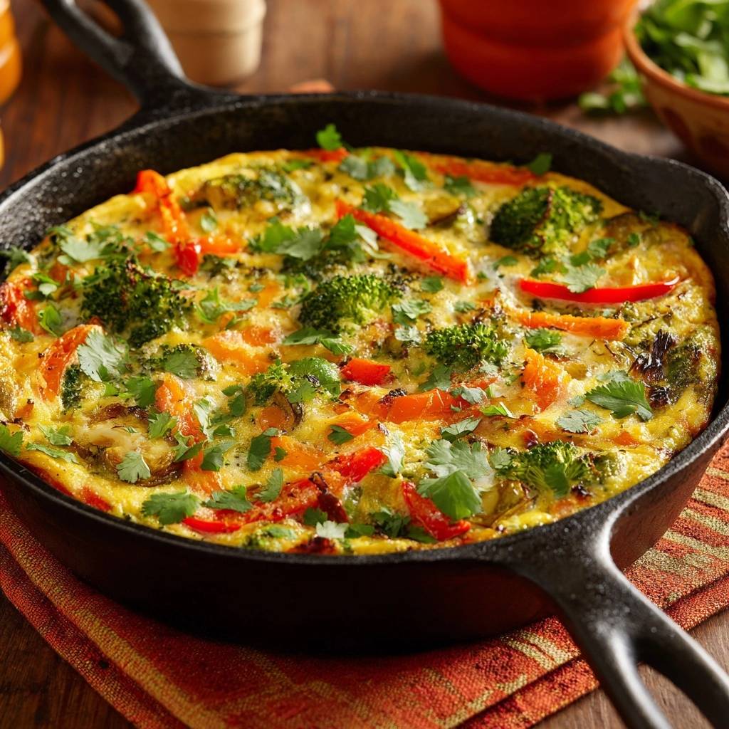 Der erste Bissen in diese Bunte Gemüse-Frittata explodiert förmlich im Mund. Knackiger Brokkoli mischt sich mit dem nussigen Aroma von Rosenkohl, während rote und orange Paprika süße Frische bringen und Karotten eine leichte Erdigkeit. Der Duft von frischem Koriander zieht durch die Küche, und die Eier umhüllen alles fluffig, ohne eine Spur Feuchtigkeit.