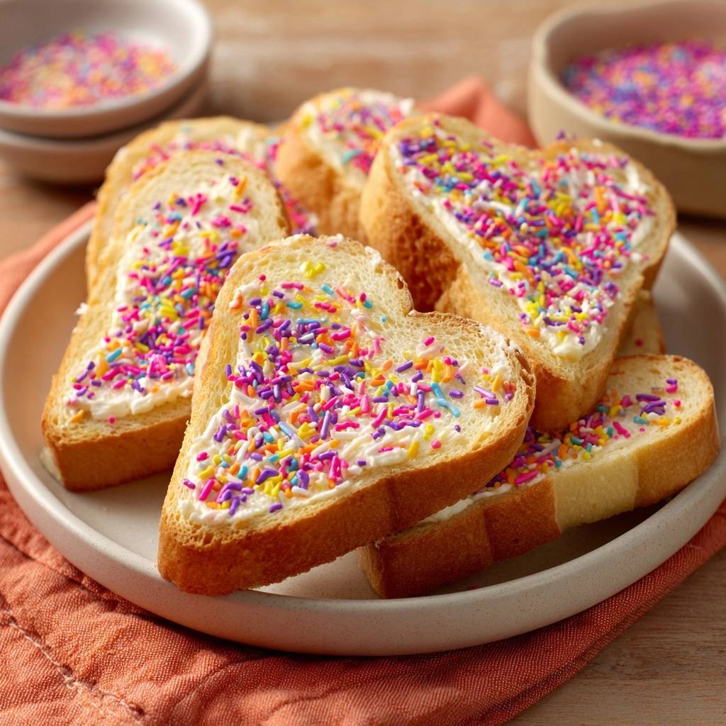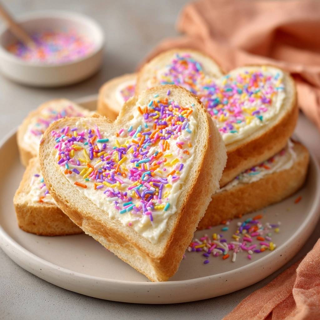 Stell dir vor, du beißt in ein knuspriges Herz aus Toastbrot, das mit cremigem Frischkäse gefüllt ist und bunte Streusel, die partout nicht abrutschen. Der erste Biss knackt leicht, dann kommt die süße Creme mit den fest eingebetteten Streuseln – pure Freude pur! Bei meiner letzten Kinderparty habe ich 20 solcher Bunte Herz-Toasts in fünf Minuten leer räumen sehen. Die Kleinen haben sie verschlungen, ohne dass ein einziges Streuselkörnchen auf dem Teller landete.