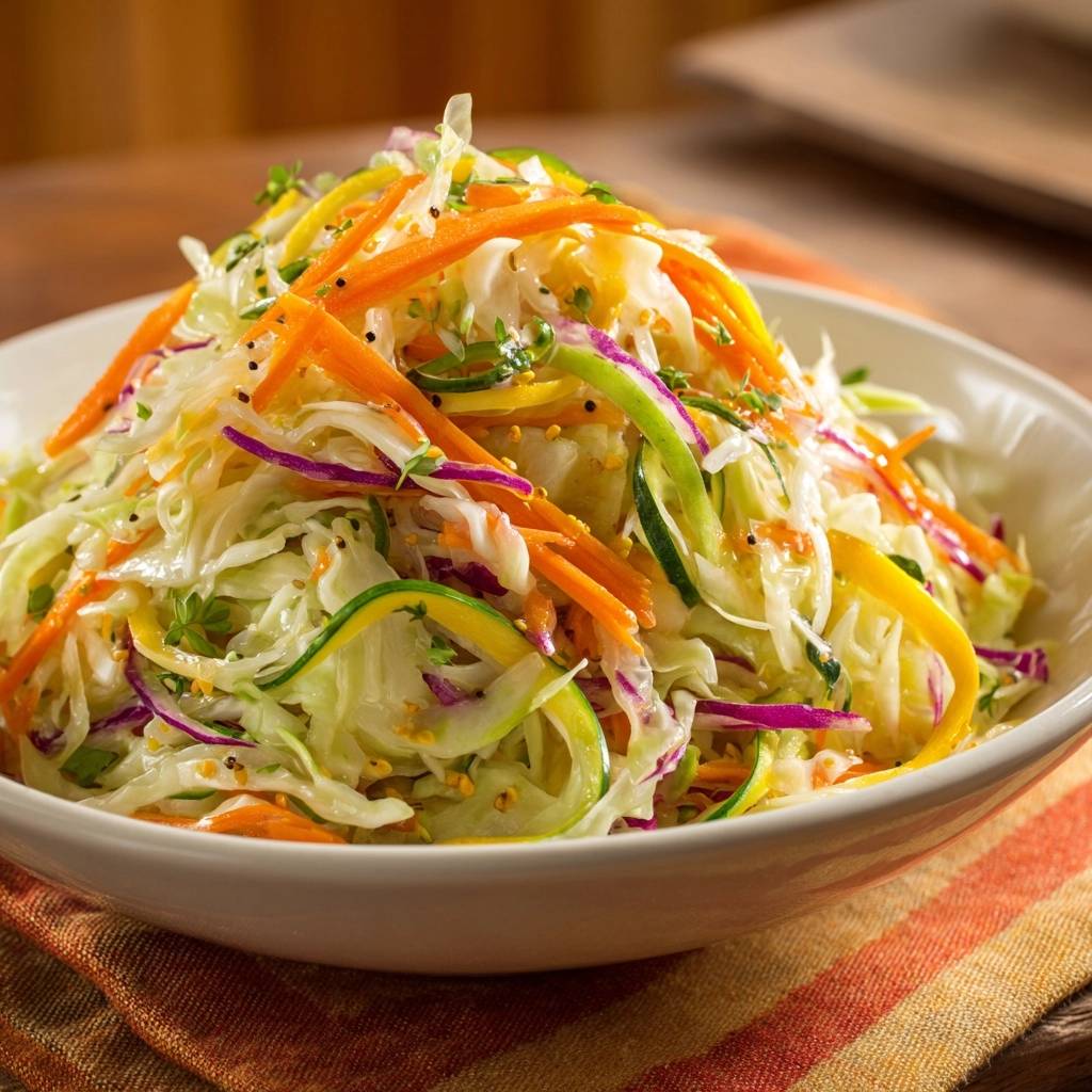 Stell dir vor, du nimmst die erste Gabel dieses bunten Gemüse-Coleslaws. Knackig beißt der Weißkohl durch, die Karotten knirschen frisch, und die Zucchini bringt eine leichte Süße mit. Der Duft von Apfelessig und Petersilie steigt auf, während das Dressing perfekt haftet – ohne eine Spur von Wässrigkeit.