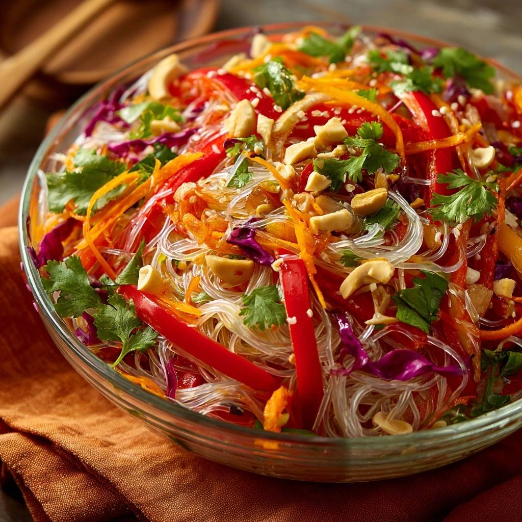 Der erste Bissen knirscht so herrlich zwischen den Zähnen. Frische Paprikastreifen mischen sich mit knackigen Glasnudeln, und die Erdnüsse geben diesen perfekten Crunch. Dazu der Duft von Limette, Ingwer und Sesamöl – purer Sommer auf dem Teller.