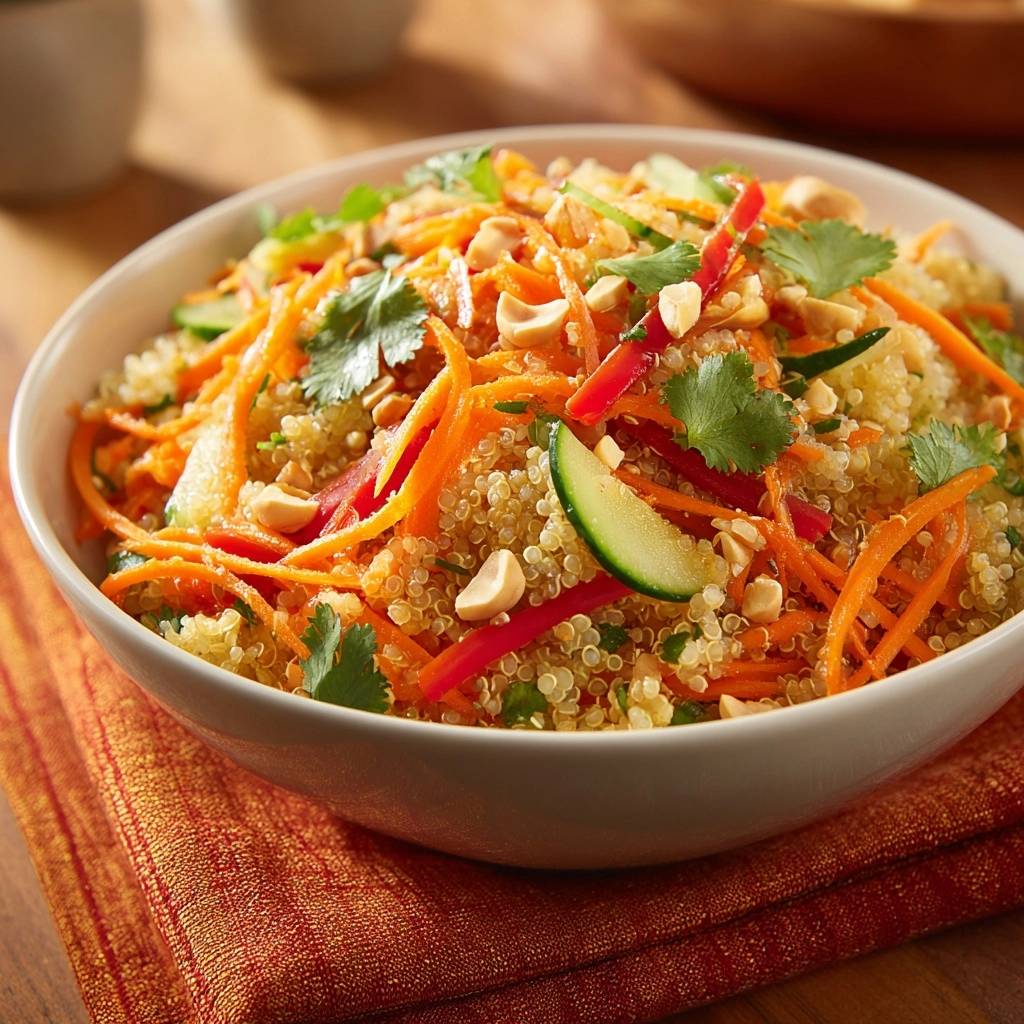Stell dir vor, du öffnest den Deckel vom Topf und da ist sie: fluffige Quinoa, die sich perfekt löst, ohne einen Hauch von Matsch. Dazu knackige Karottenstreifen, die im Mund knacken, frische Gurke, die erfrischt, und rote Paprika, die Farbe und Süße bringt. Der Duft von frischem Koriander mischt sich mit gerösteten Erdnüssen, die bei jedem Bissen knuspern.