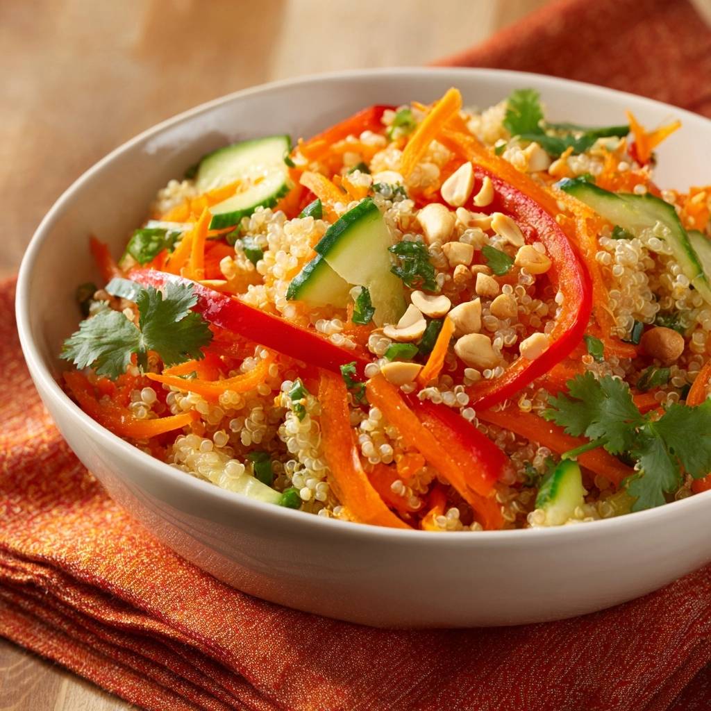 Der Salat ist vegan und vegetarisch. Reich an Ballaststoffen aus Quinoa und Gemüse, Vitaminen A und C aus Karotten und Paprika. Protein aus Erdnüssen macht satt. Perfekt für gesunde Ernährung.