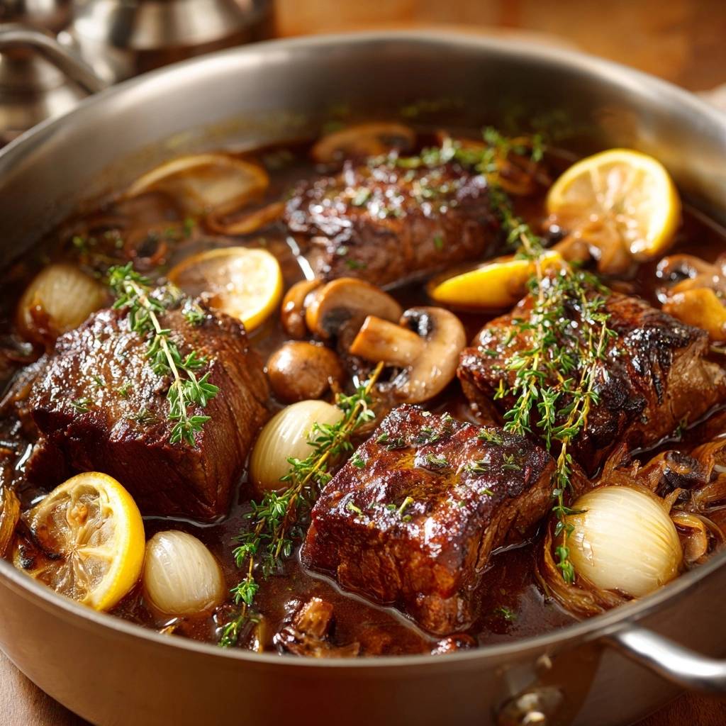 Du kriegst hier garantiert butterzartes Rindfleisch mit Pilzen und Perlzwiebeln. Kein Risiko, nur purer Genuss. Die Zitrone balanciert die Säure, Thymian gibt erdige Tiefe. Lass uns loslegen.