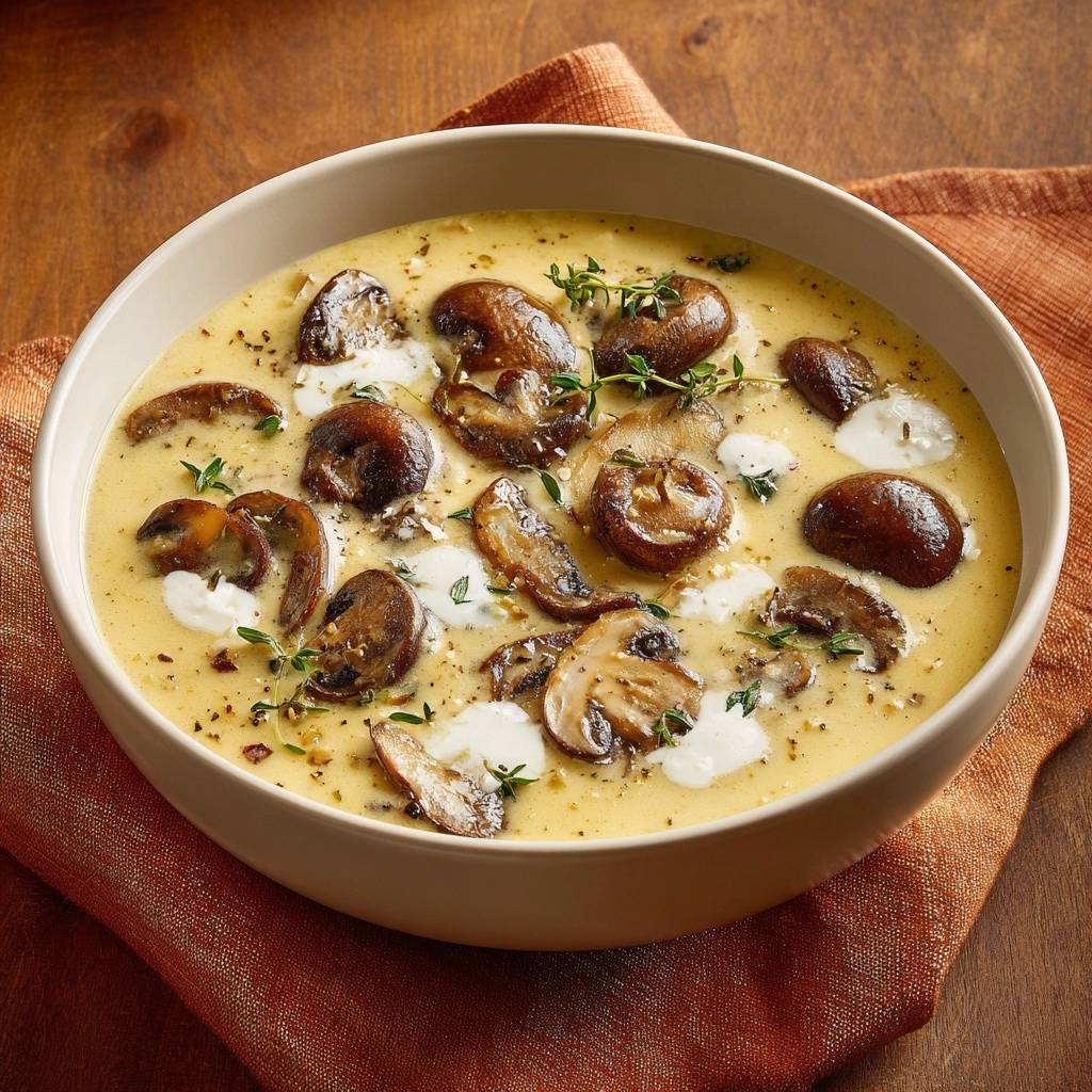 Stell dir vor, du nimmst den ersten Löffel dieser Suppe: cremig, erdiger Pilzgeschmack, der sich mit dem frischen Thymian vermischt. Der Duft steigt auf, würzig und einladend, und die goldbraunen Champignons knacken leicht unter dem Löffel.