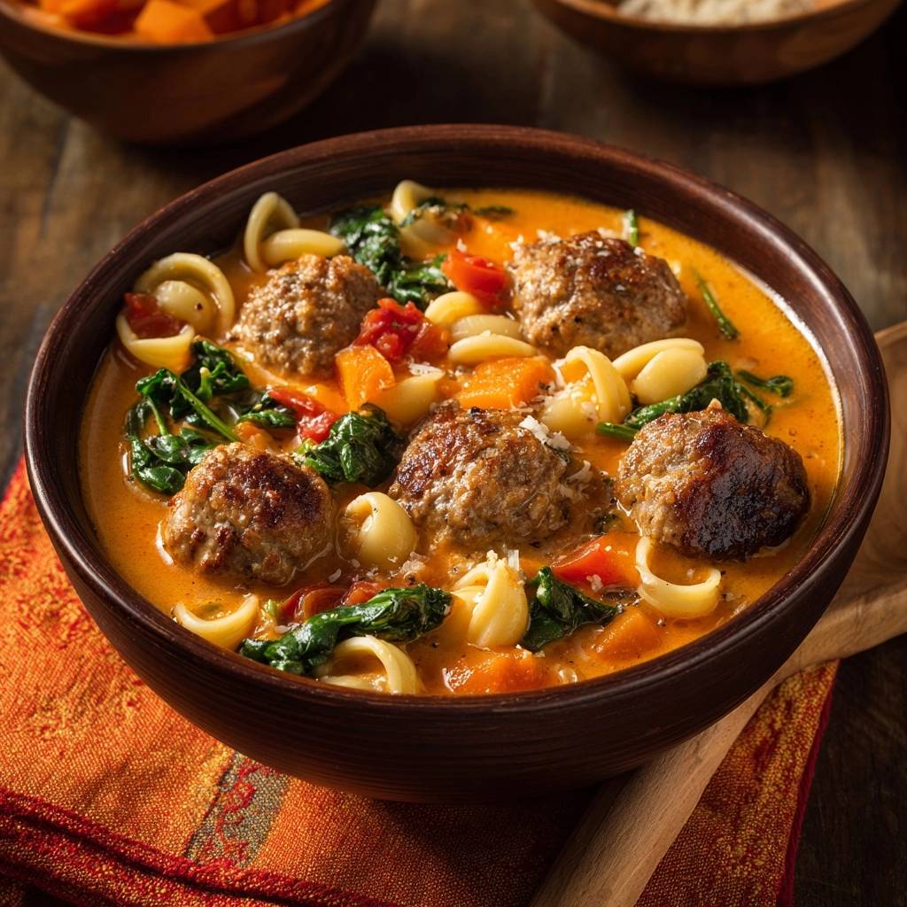 Stell dir vor, du beißt in eine dieser saftigen Fleischbällchen, und sie zerfällt nicht zu Brei. Stattdessen knackige Kruste außen, zart innen, umhüllt von cremiger Tomatensuppe mit Orecchiette, die perfekt mitschmiegen. Der Duft von angebratenem Hack und frischem Spinat steigt auf, während die Karotten süßlich weich werden. Ich hab jahrelang geflucht, wenn meine Bällchen in der Suppe auseinanderbrachen – matschig, fade, total enttäuschend.
