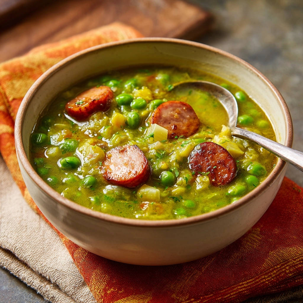 Die Rinder- oder Geflügelwürstchen verleihen der Suppe eine wunderbare Herzhaftigkeit und einen angenehmen Kontrast zur Süße der Erbsen.