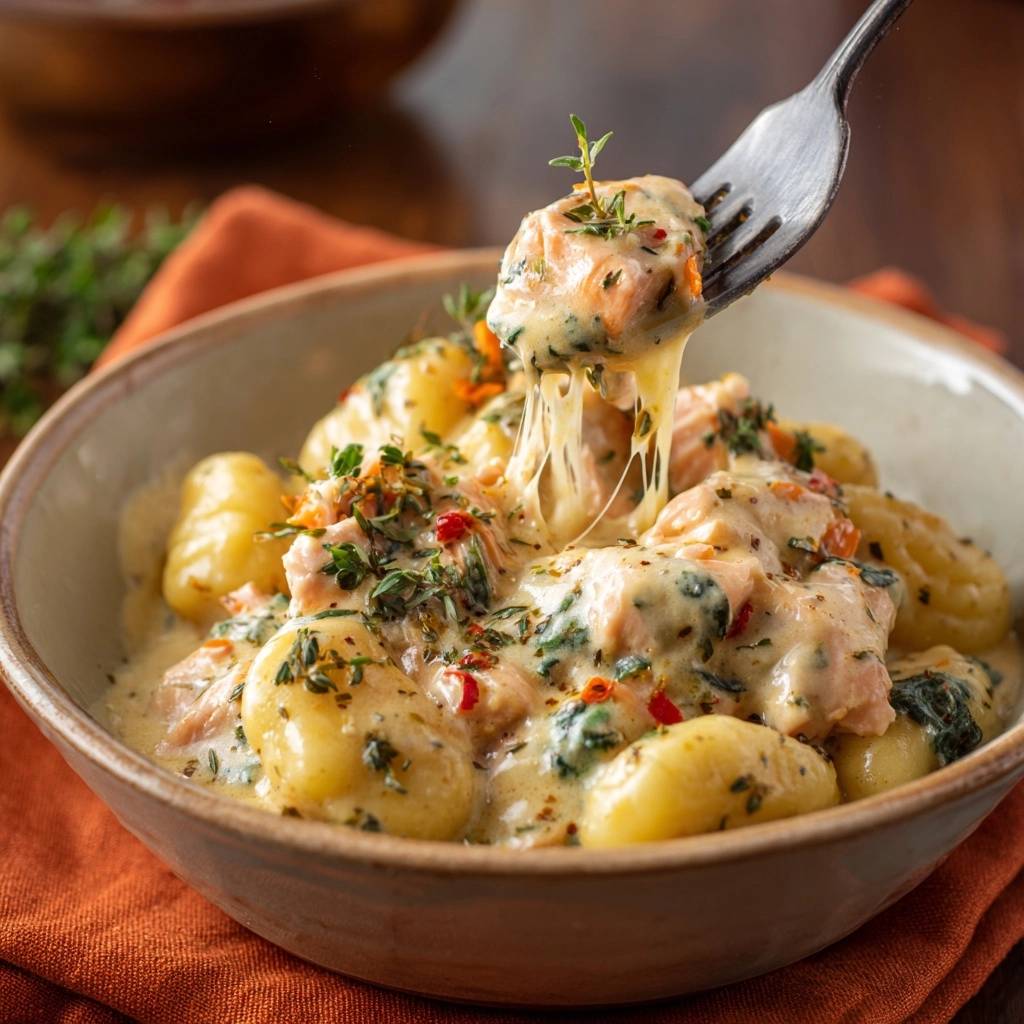 Stell dir vor, du öffnest den Deckel der Pfanne und ein Duft von frischem Thymian, Knoblauch und einem Hauch Chili steigt auf. Die Gnocchi sind goldknusprig außen, fluffig innen und baden in einer cremigen Sauce mit zartem Lachs. Der erste Bissen explodiert im Mund: Bissfest, saftig, unwiderstehlich.
