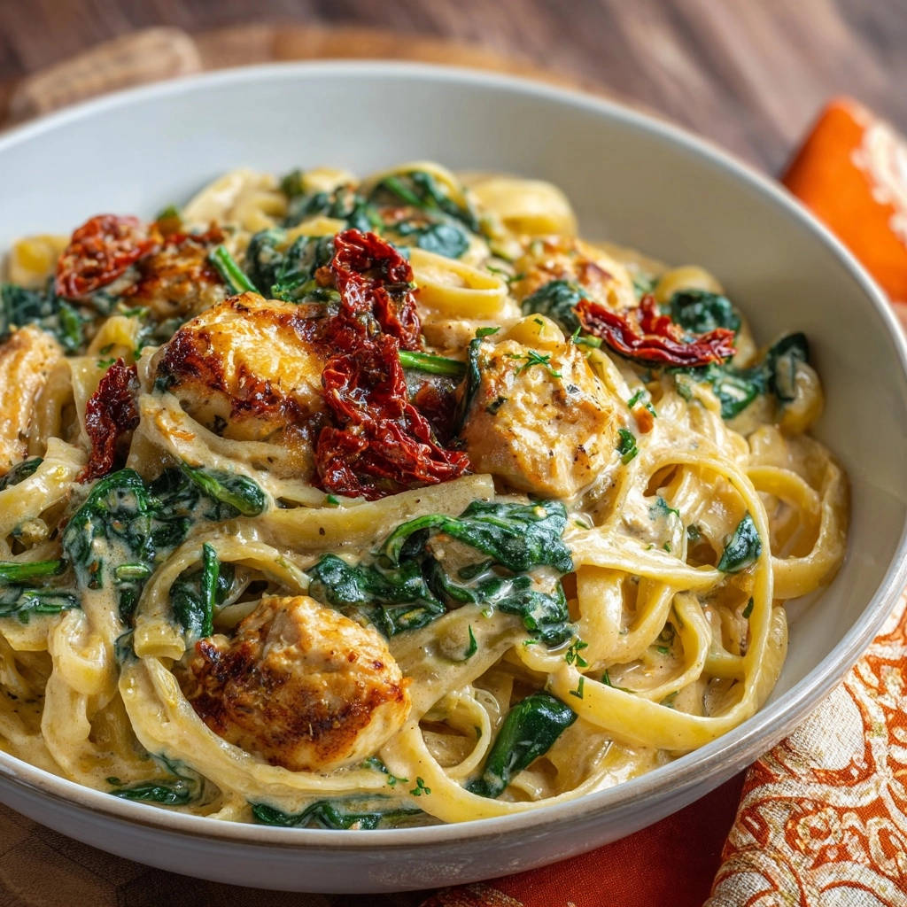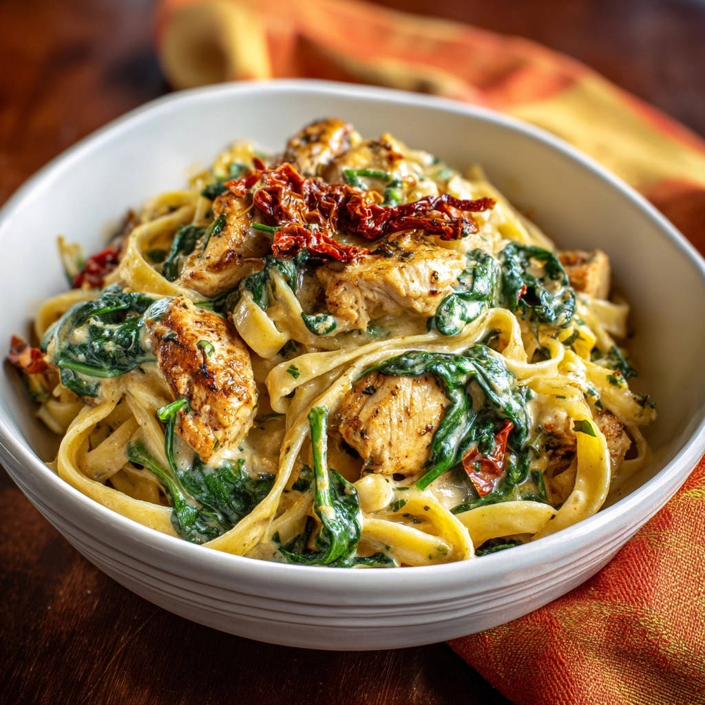 Cremige Hähnchen-Spinat-Pasta mit getrockneten Tomaten