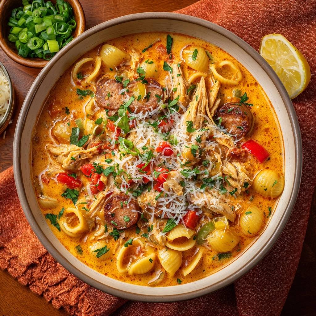 Stell dir vor, du beißt in diese cremigen Conchiglie, und die Nudeln knacken bissfest zwischen den Zähnen. Die würzige Paprikawurst mischt sich mit zartem Hähnchen, knackiger Paprika und salzigen Oliven. Der Duft von frischer Sahne und gerösteten Gewürzen zieht durch die Küche, und plötzlich fühlst du dich wie in einem italienischen Trattoria.