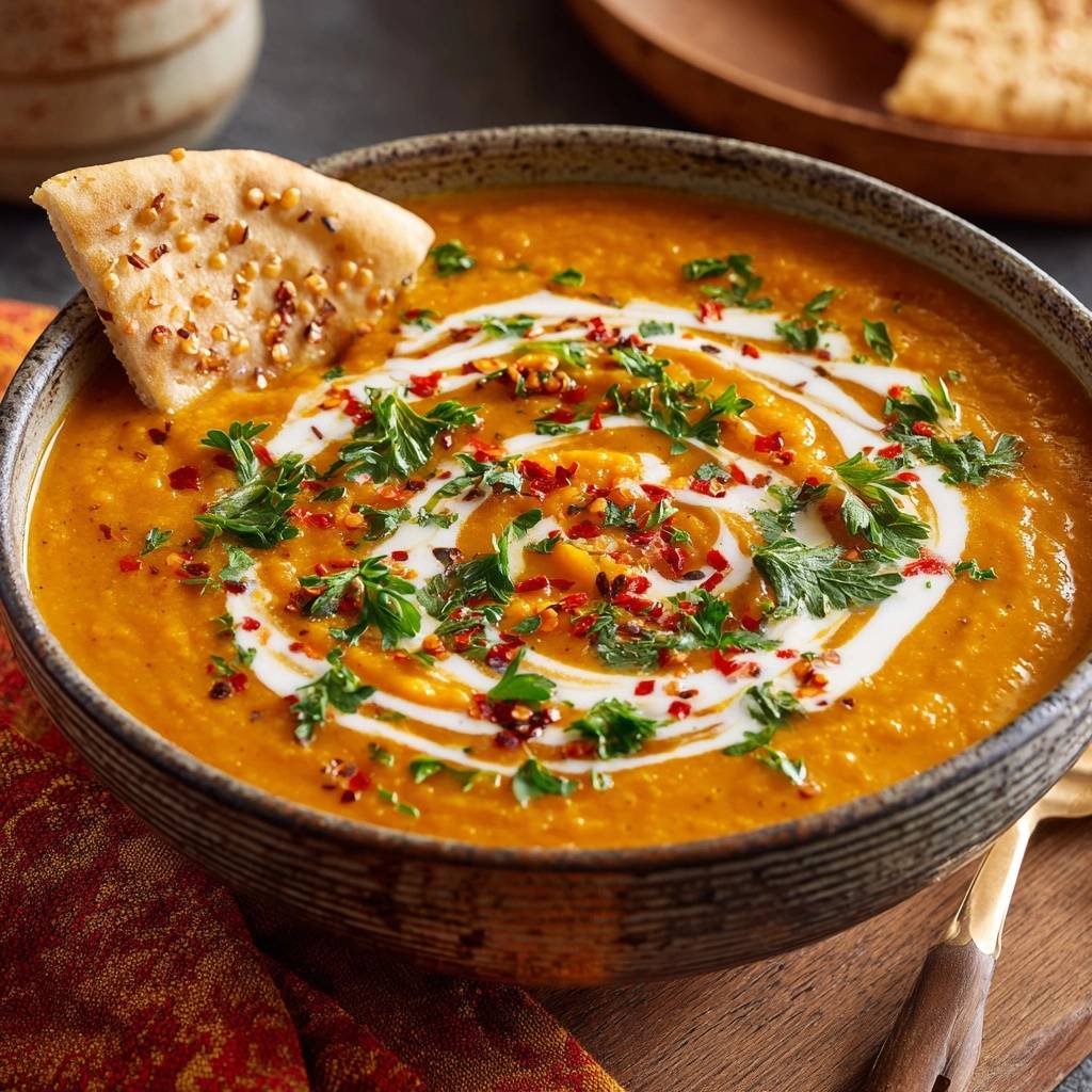 - Suppe heiß servieren: Einen Sahneswirle daraufgeben, mit Petersilie, Chiliflocken und Naan garnieren. Dippen und genießen – fluffig-cremig garantiert!