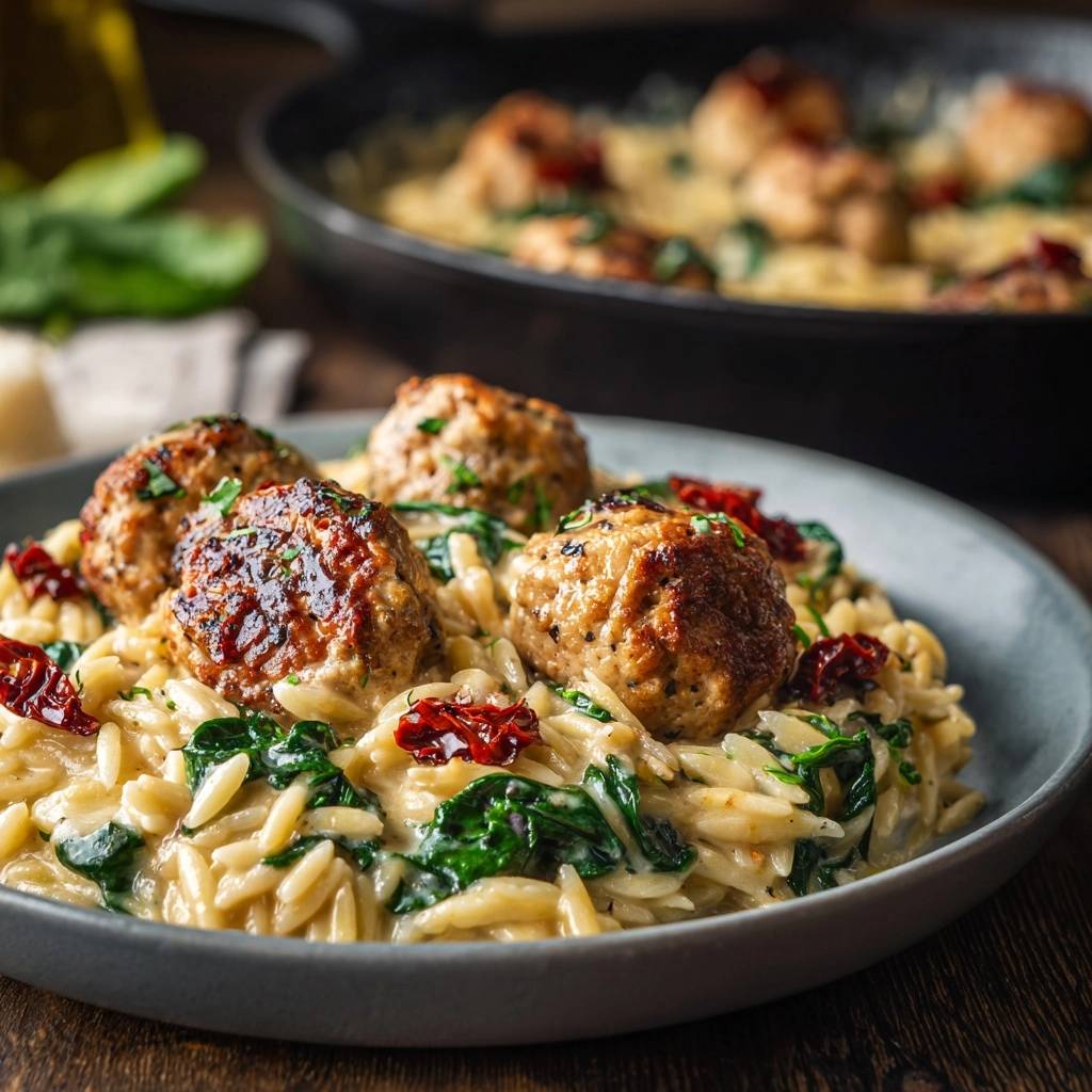 Cremige Orzo-Pfanne mit Fleischbällchen
