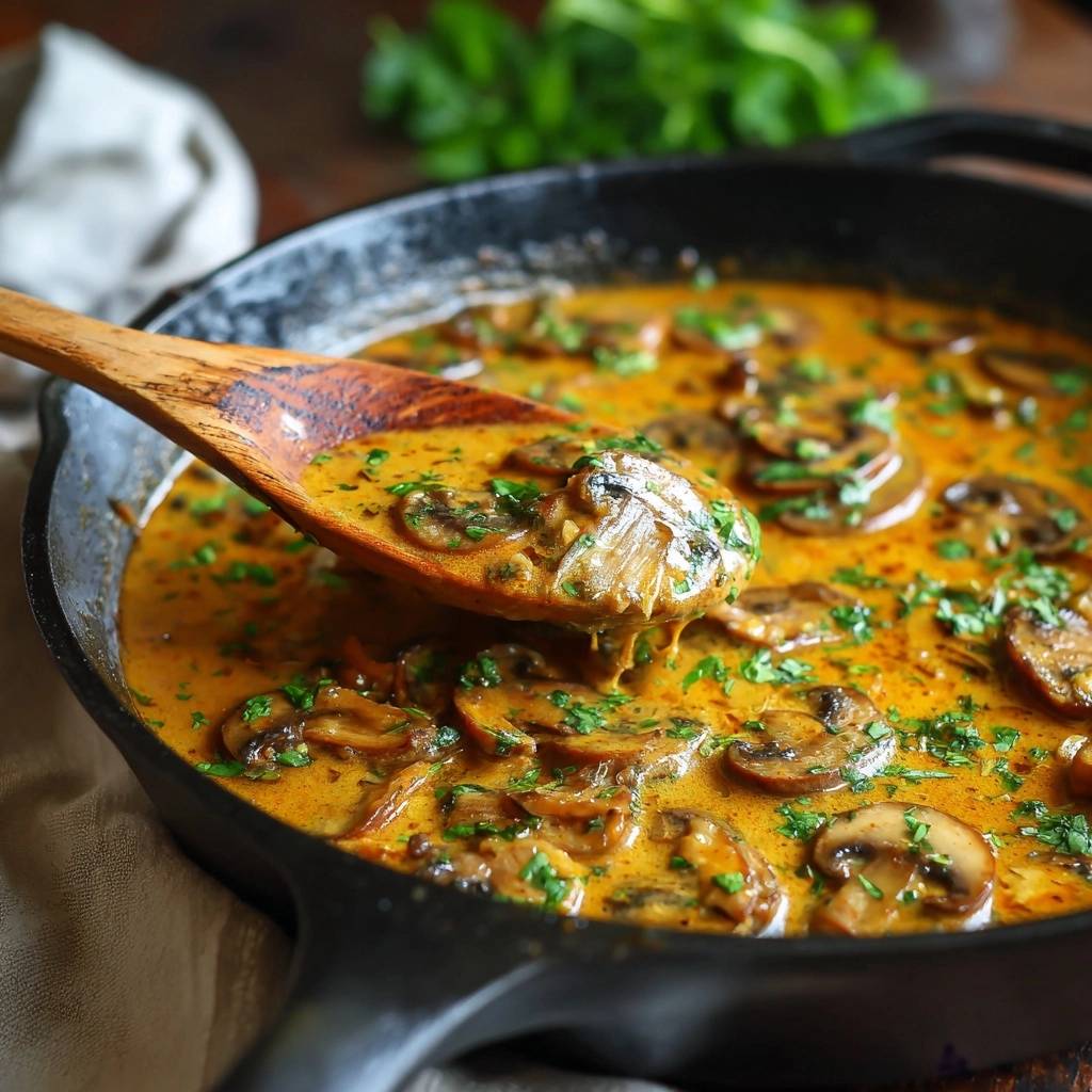 - Gebratene Pilze zurück in die Soße geben, 2 Minuten ziehen lassen. Mit gehackter Petersilie bestreuen und servieren. Fertig – perfekt saftige Pilze in aromatischer Soße!