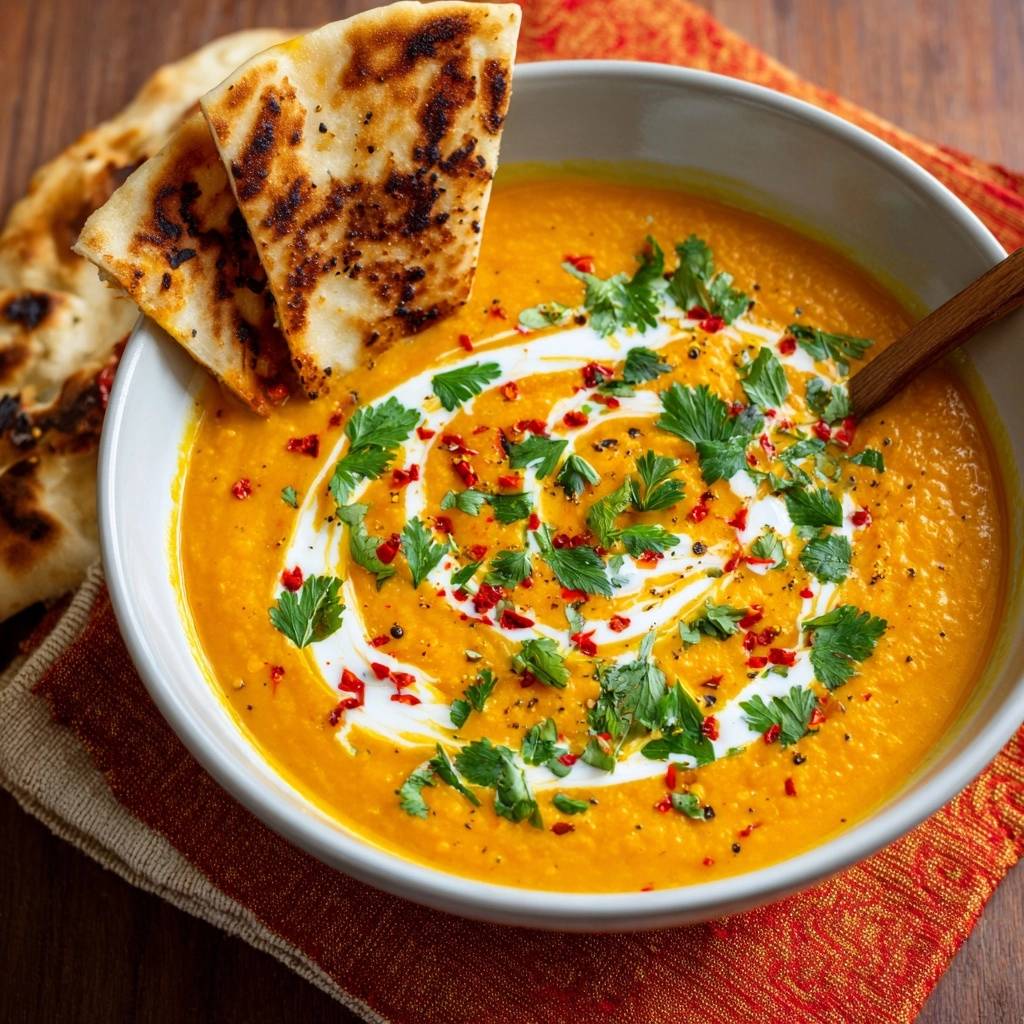 Stell dir vor, du tauchst ein warmes, knuspriges Stück Naan in eine Schale voller samtiger, leuchtend oranger Suppe. Der Duft von Kreuzkümmel und frischem Ingwer steigt dir in die Nase, während die leichte Schärfe der Chili deine Lebensgeister weckt.