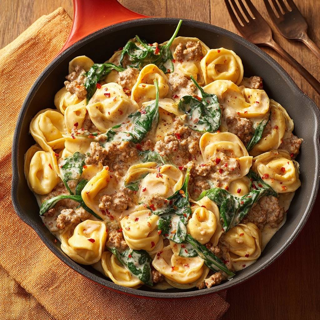Cremige Tortellini-Pfanne mit Rinderhack und Spinat (Keine wässrige Soße mehr)