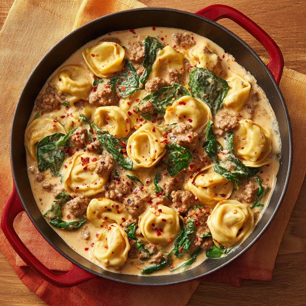 Cremige Tortellini-Pfanne mit Rinderhack und Spinat