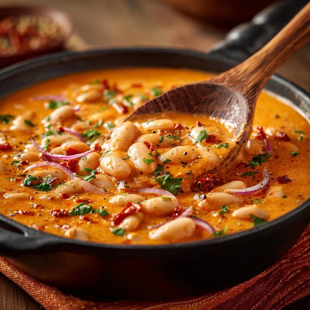 Stell dir vor, du löffelst die erste cremige Portion cremiger weißer Bohnen mit Sonnentomaten. Der Duft von sonnengetrockneten Tomaten mischt sich mit der samtigen Soße, die sich perfekt um die ganzen Bohnen schmiegt. Kein Tropfen läuft aus, nur pure Geschmacksexplosion.