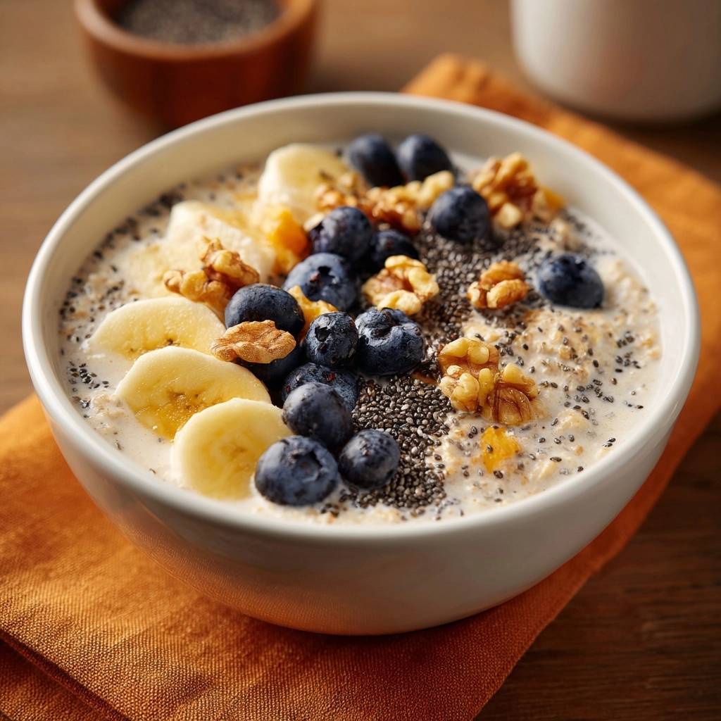 - Mit Bananenscheiben, Blaubeeren, gehackten Walnüssen und Chiasamen toppen. Fertig – perfekt cremig!