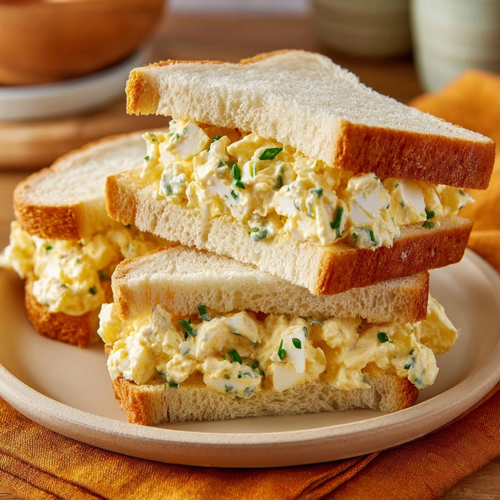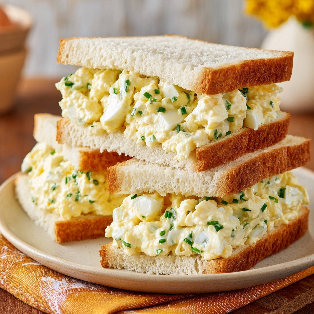- Sandwiches zubereiten: Bestreichen Sie jede Scheibe Weißbrot großzügig mit dem fertigen Eiersalat. Legen Sie jeweils eine zweite Brotscheibe darauf und schneiden Sie die Sandwiches diagonal durch, um die klassische Dreiecksform zu erhalten. Sofort servieren oder für kurze Zeit im Kühlschrank aufbewahren. Genießen Sie jeden perfekt cremigen Bissen!