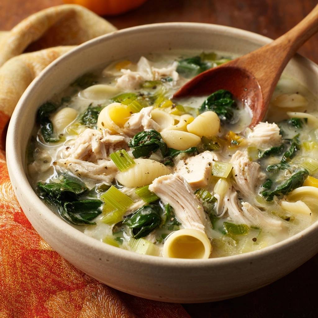 Stell dir vor, du tauchst den Löffel in eine Schüssel voller Samtigkeit. Der Duft von frischem Lauch und kräftiger Hühnerbrühe steigt dir in die Nase, während die kleinen Muschelnudeln genau den richtigen Biss haben.