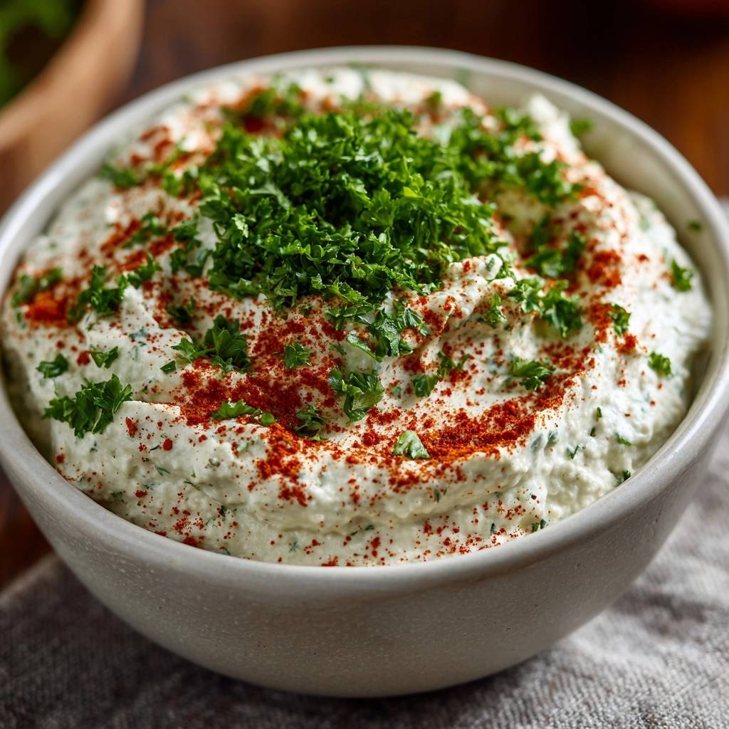 - Dip in eine Schüssel füllen, mit restlicher gehackter Petersilie und Paprikapulver großzügig bestreuen. Fertig – nie wieder körniger Frust, nur pure Cremigkeit! Guten Appetit.