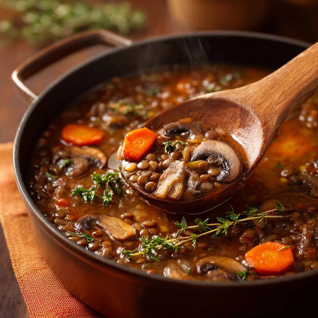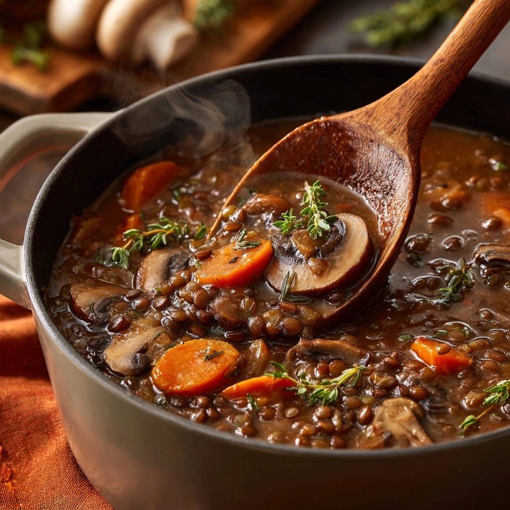 Stell dir vor, du nimmst den ersten Löffel von diesem Eintopf. Die cremige Textur umhüllt deine Zunge, Pilze mit intensivem Umami-Geschmack mischen sich mit den erdigen Linsen. Der Duft von frischem Thymian steigt auf, und du fragst dich, warum du das nicht früher gekocht hast.