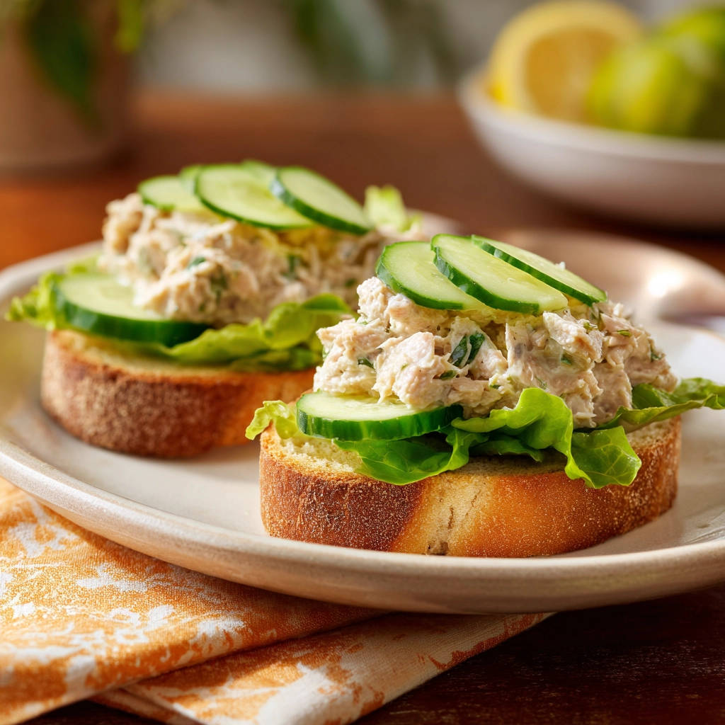 - Anrichten und Genießen. Legt die frisch gerösteten Brotscheiben auf eure Teller. Belegt jede Brotscheibe mit einigen frischen Blättern Blattsalat. Gebt dann eine großzügige Portion eures cremigen Thunfischsalats darauf. Platziert ein paar frische Gurkenscheiben daneben oder darauf zur Garnierung. Sofort servieren und genießen, solange das Brot noch warm und knusprig ist und der Salat herrlich cremig.