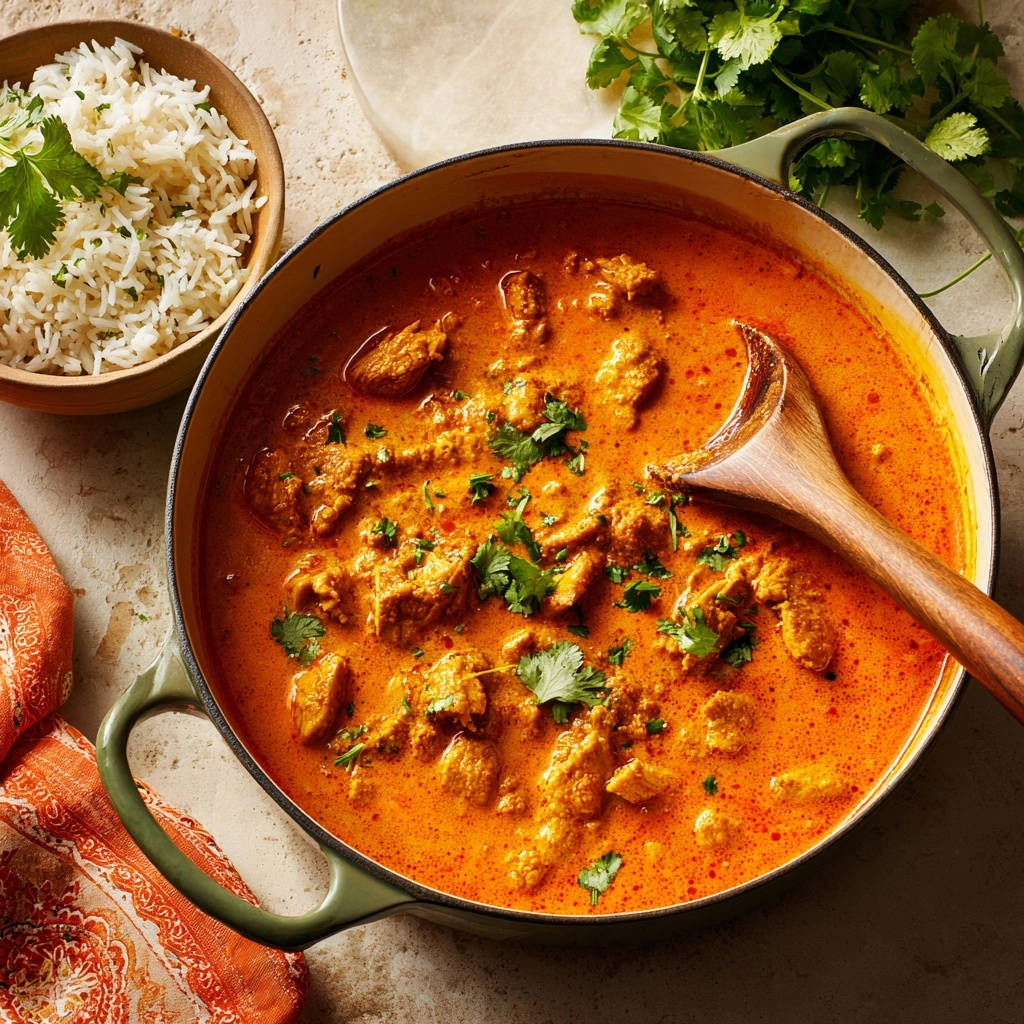 - Serviert das cremige Hähnchen-Curry heiß, großzügig garniert mit frischem Koriander und Basmatireis. Genießt jedes saftige Stück Hähnchen, das sich förmlich auf der Zunge zergeht!