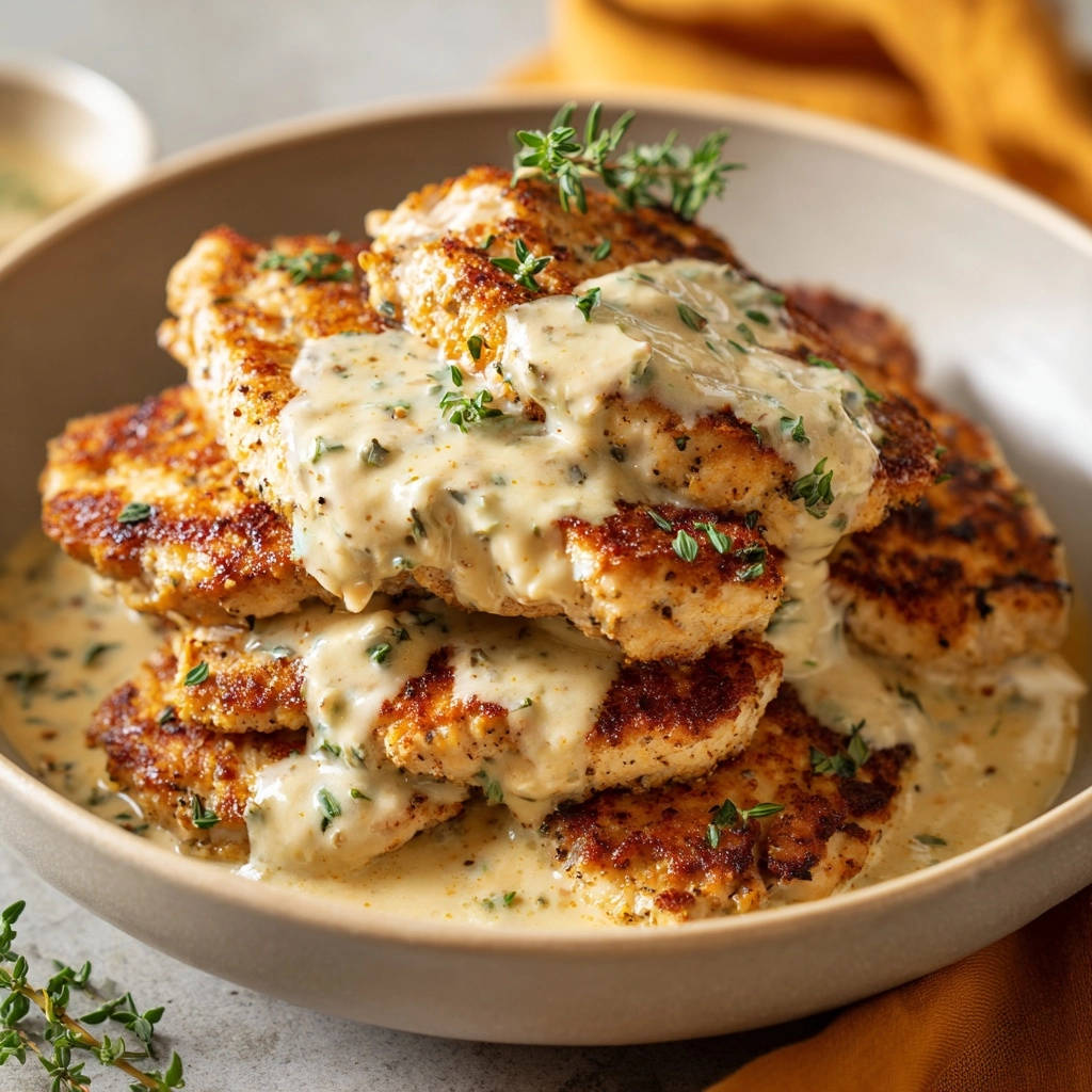 Richten Sie die Hähnchenscheiben in tiefen Tellern an und übergießen Sie sie großzügig mit der cremigen Kräutersauce.Dies ist der Moment, in dem die ganze Mühe belohnt wird und das Gericht seine volle Wirkung entfaltet.