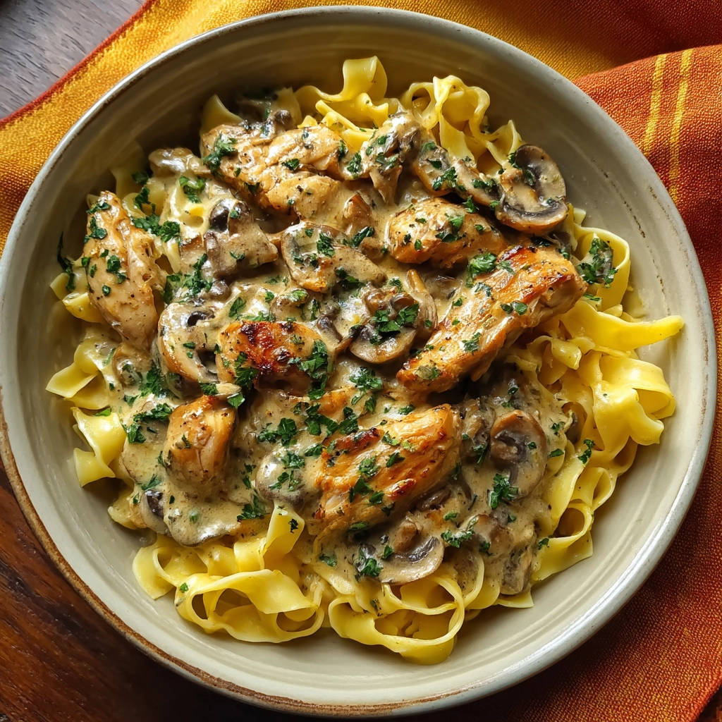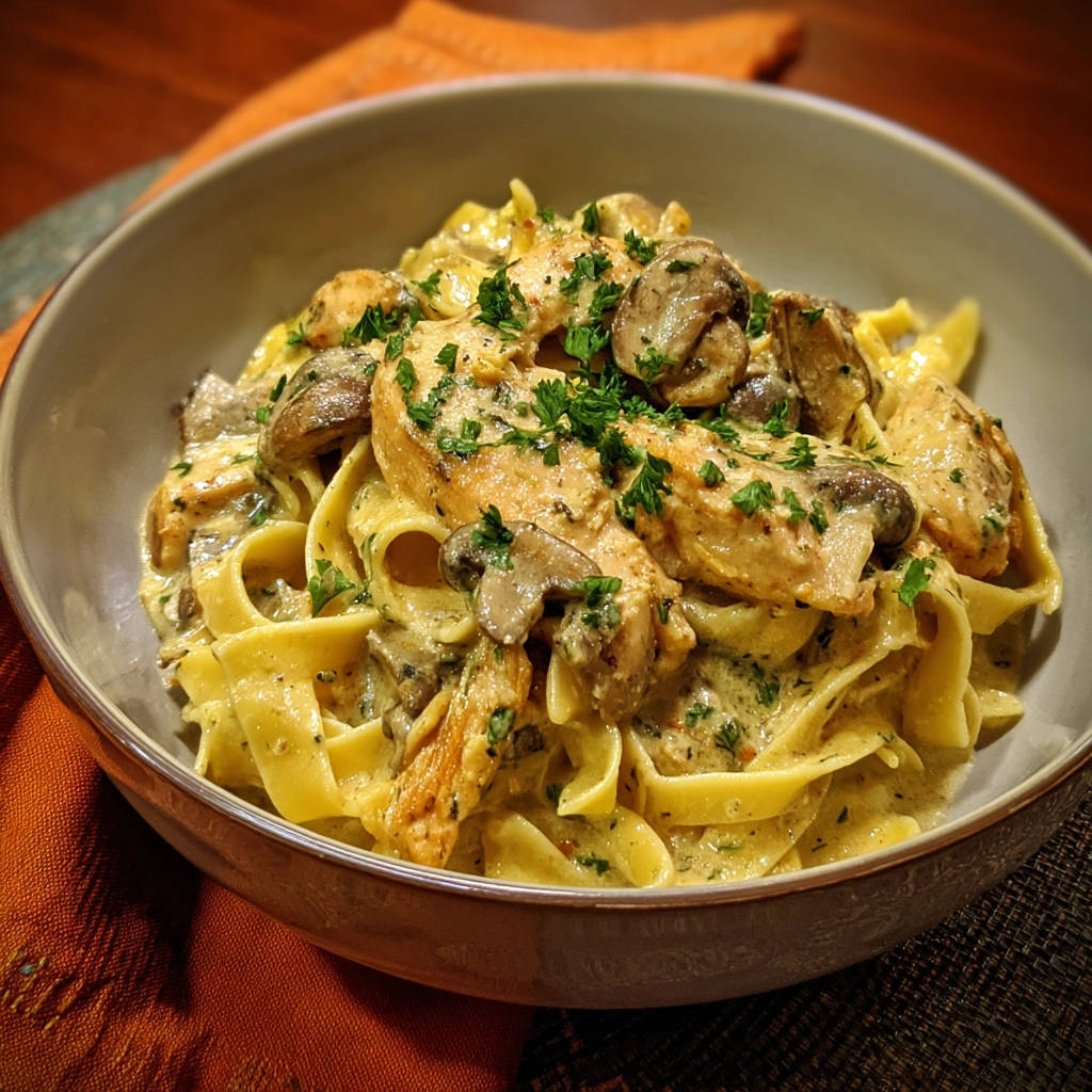 Cremiges Hähnchen mit Pilzrahmsoße auf Bandnudeln