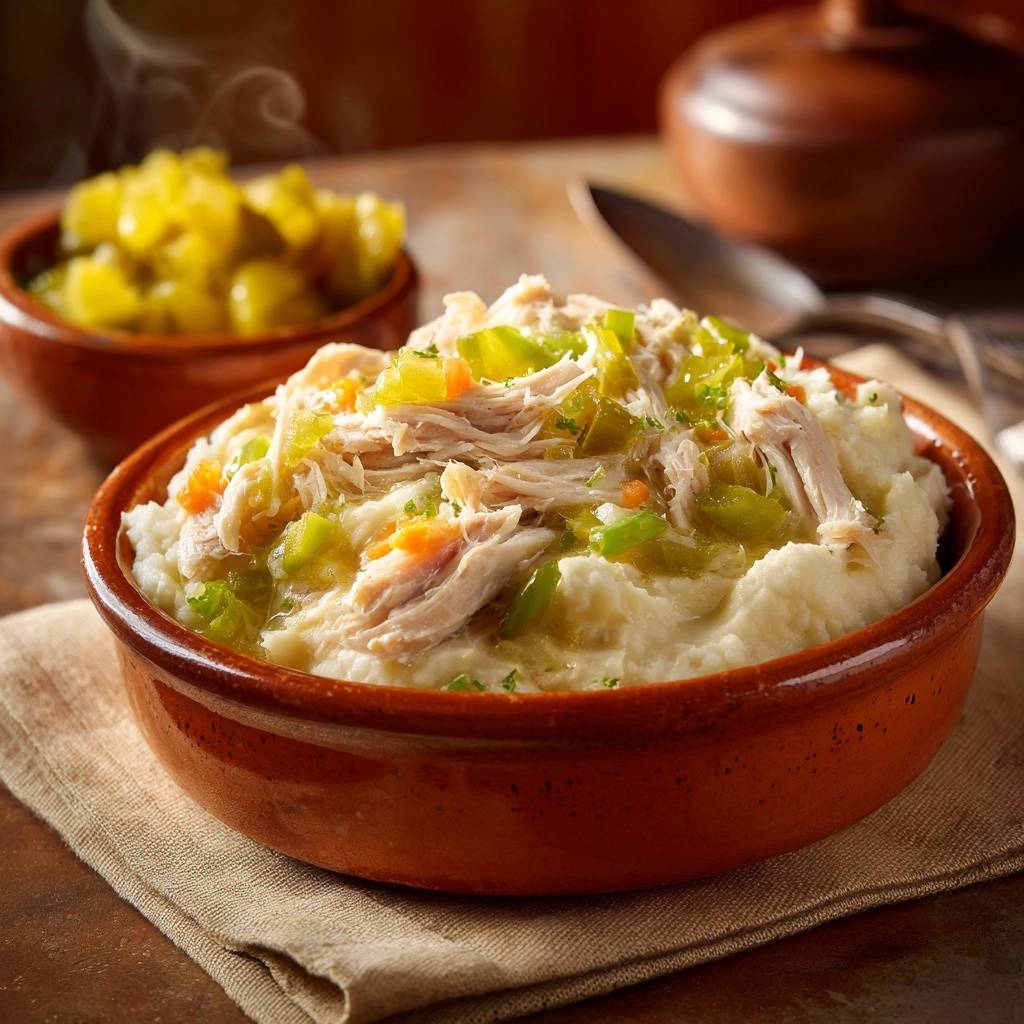 Cremiges Hühner-Frikassee auf Kartoffelstampf