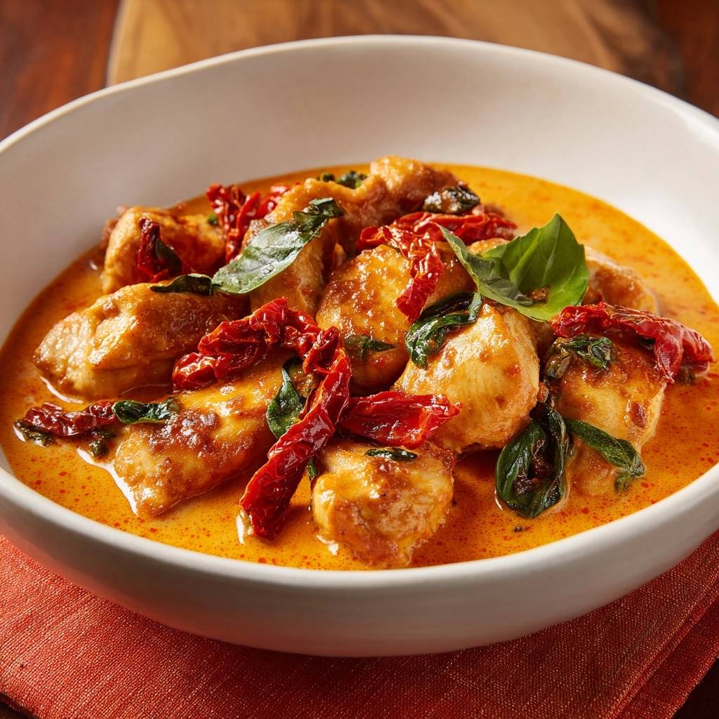 Stell dir vor, du löffelst das erste Mal aus diesem cremigen Hühnercurry mit Tomaten & Spinat. Die Kokosmilch umhüllt saftiges Hähnchenfleisch, sonnengetrocknete Tomaten explodieren mit intensivem Umami, und frischer Spinat bringt knackige Frische rein. Jeder Bissen ist pure Wärme, cremig und nie trocken.
