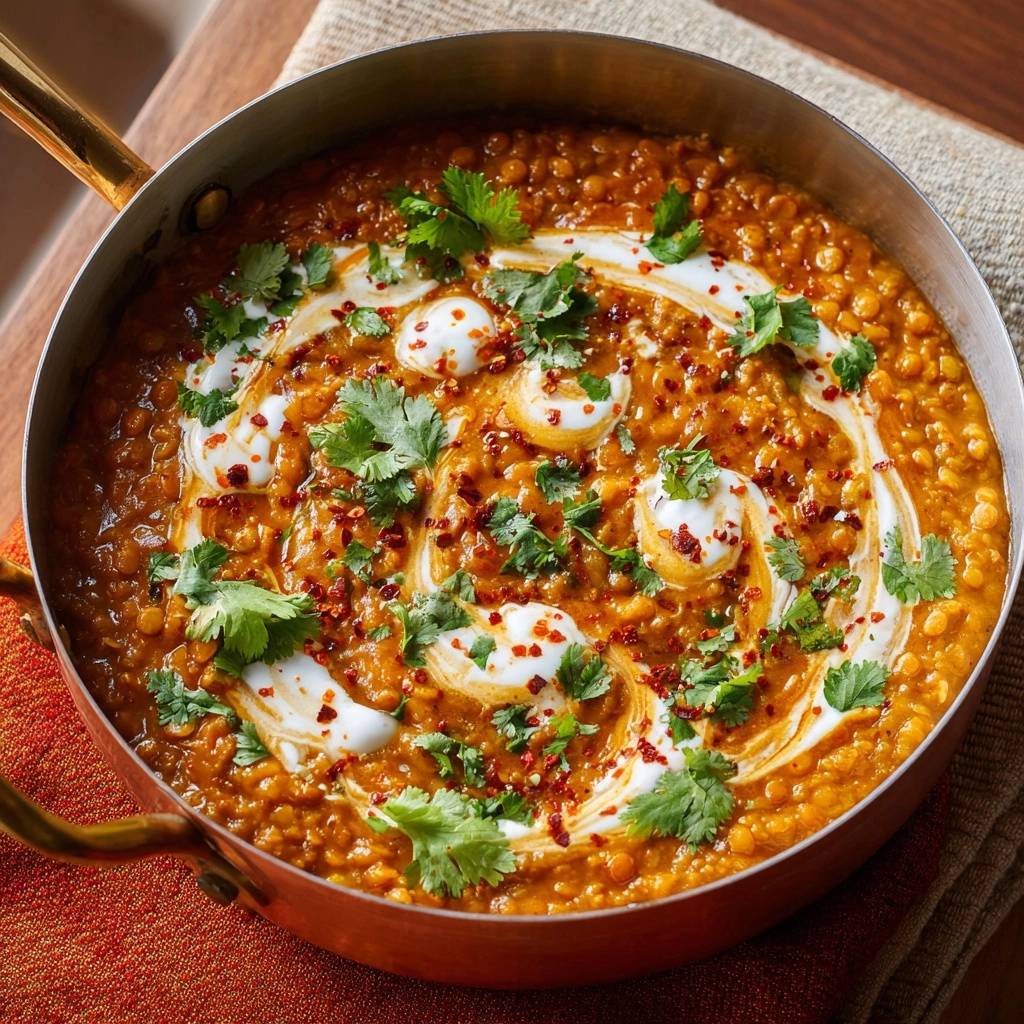 - Mit Joghurt-Klecksen, frischem Koriander und getrockneten roten Chilis garnieren. Heiß servieren – dampfend perfekt!