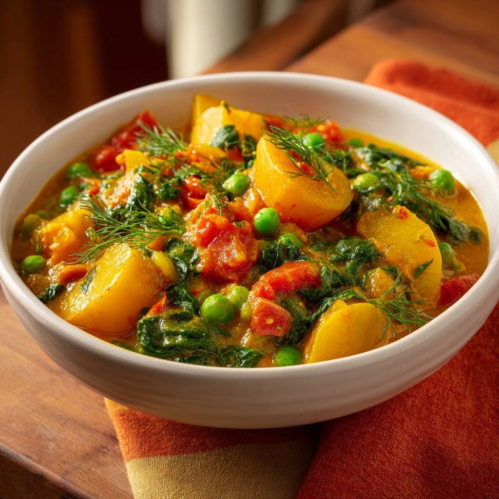Frischer Spinat fällt zusammen, Erbsen geben Biss, Dill hebt alles auf eine neue Stufe. Vegetarisch, schnell zubereitet, und die Sauce bindet sich wie von Zauberhand. Probier es aus, du wirst nie wieder altes Aloo Palak Matar wollen.