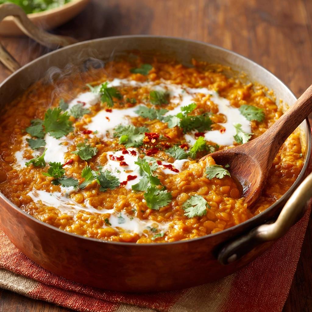 Stell dir vor, du löffelst das erste Mal in dieses cremige Linsen-Dal. Die rote Linsenmasse umhüllt deinen Löffel samtig, mit einem Hauch von Kurkuma, der golden leuchtet. Der Duft von frischem Ingwer und Koriander steigt auf, und beim Probieren explodiert der Geschmack: würzig, erdig, perfekt ausbalanciert.
