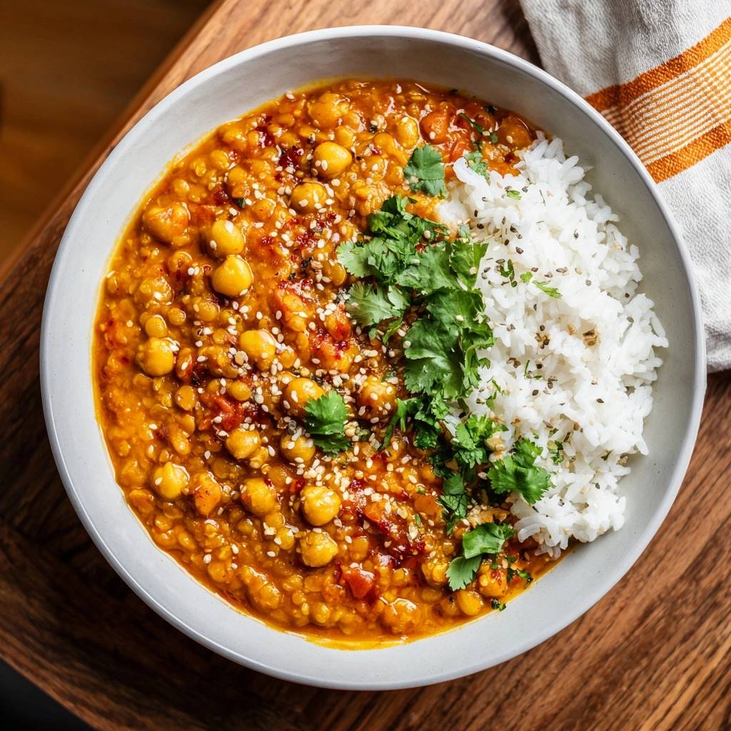 Stell dir vor, du öffnest den Topf und ein warmer Duft von gerösteten Gewürzen umhüllt dich. Der erste Löffel dieses cremigen Linsen-Kichererbsen-Dals gleitet samtig über die Zunge, mit knackigen Kichererbsen und intensiven Aromen, die perfekt balanciert sind.