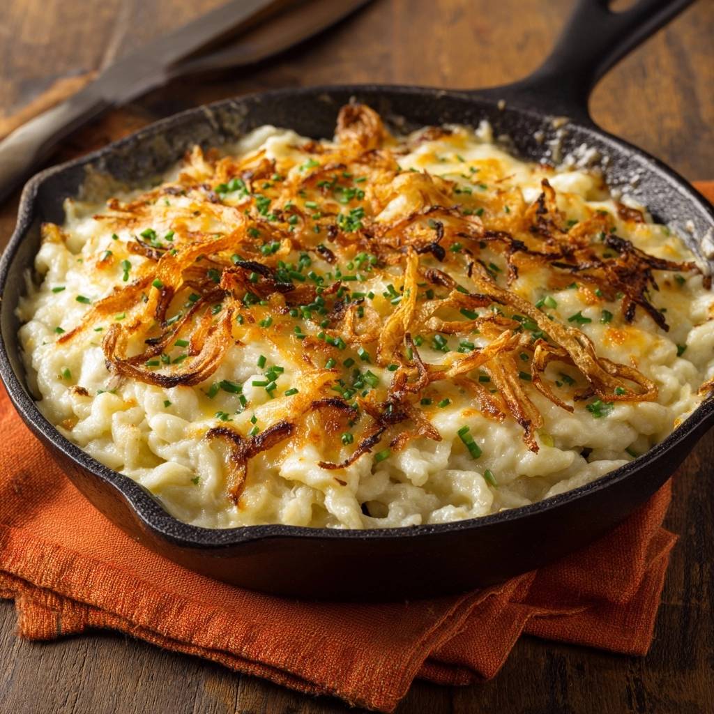 Der erste Bissen haut dich um: cremiger Käse, der sich perfekt um die Nudeln schmiegt, und oben drauf knusprige Zwiebeln, die bei jedem Biss knackig zerplatzen. Letzte Woche hab ich das in meinem Gusseisentopf gezaubert, und die ganze Familie hat geschwiegen – nur genüssliches Schmatzen war zu hören. Nie wieder diese klumpige Käsesauce, die einem den Abend verdirbt.
