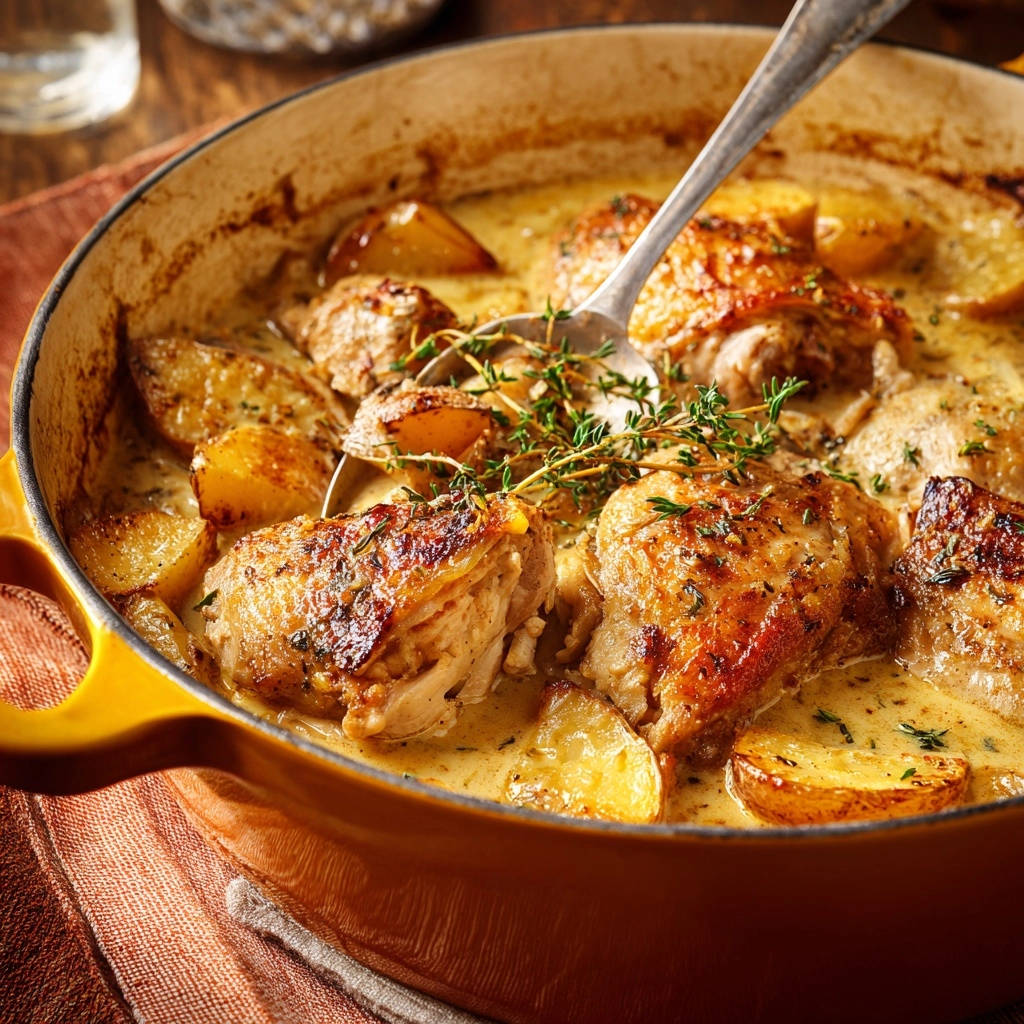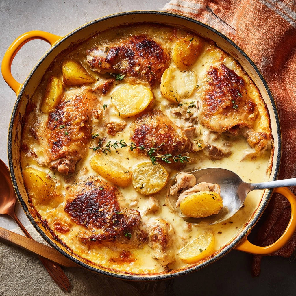 Dieses cremige Ofenhähnchen mit Kartoffeln ist ein echtes One-Pot-Wunder, bei dem Hähnchen, Kartoffeln und Soße harmonisch in einem einzigen Bräter garen.