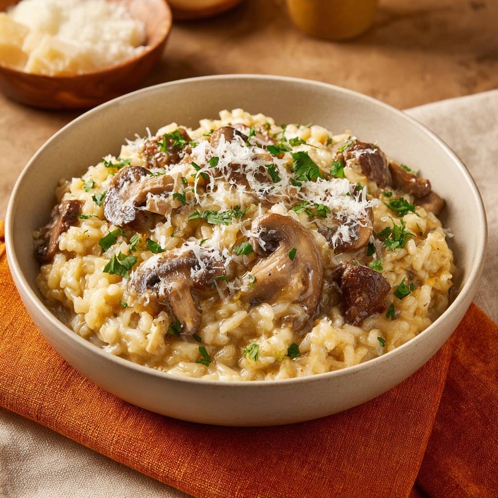 Stell dir vor, du nimmst den ersten Löffel dieses cremigen Pilzrisottos mit Rindfleisch. Die Pilze knacken leicht, das Fleisch schmilzt zart, und der Reis umhüllt alles mit sämiger Wärme. Der Duft von gebratenen Pilzen und frischem Parmesan steigt auf, während der Käse sich perfekt einbindet.
