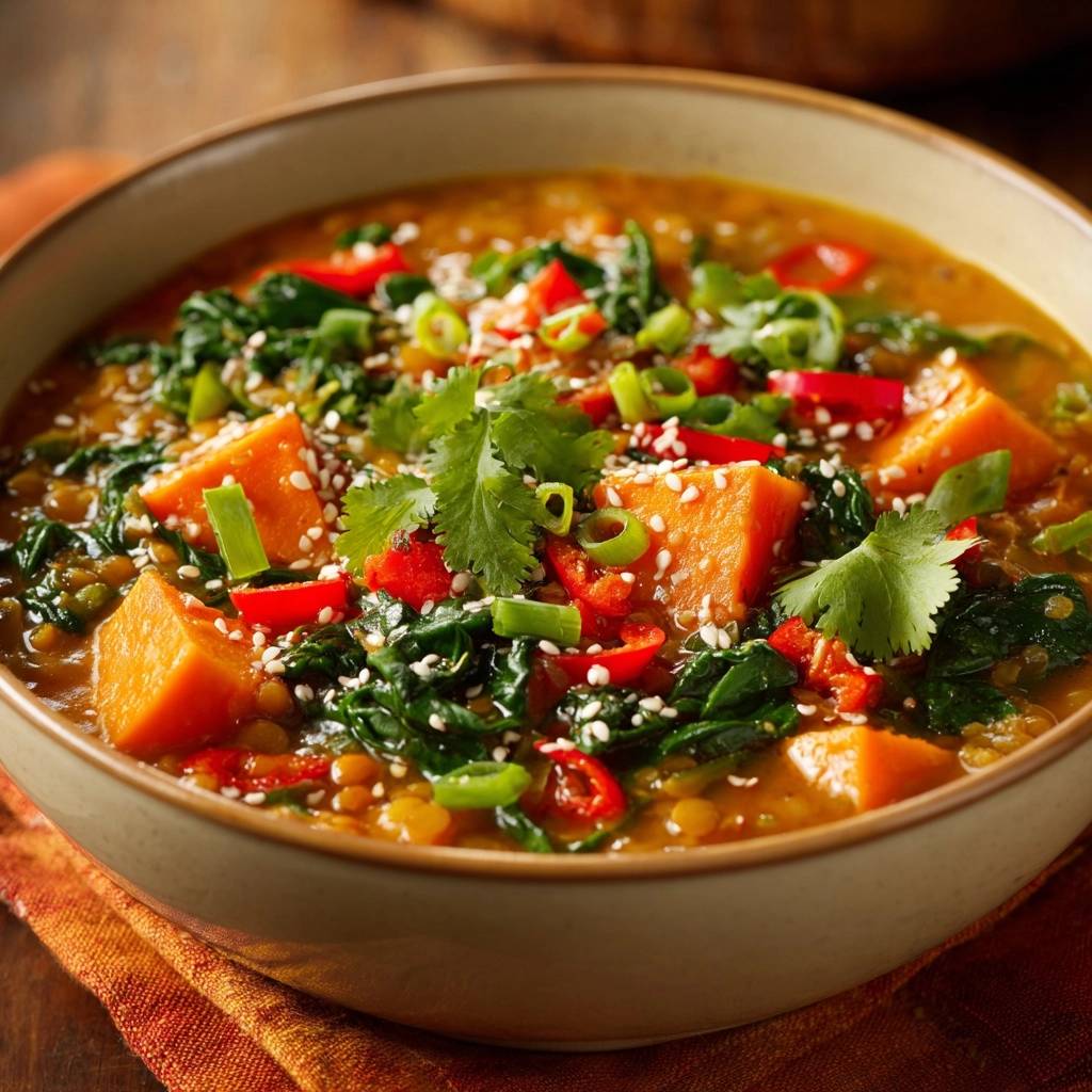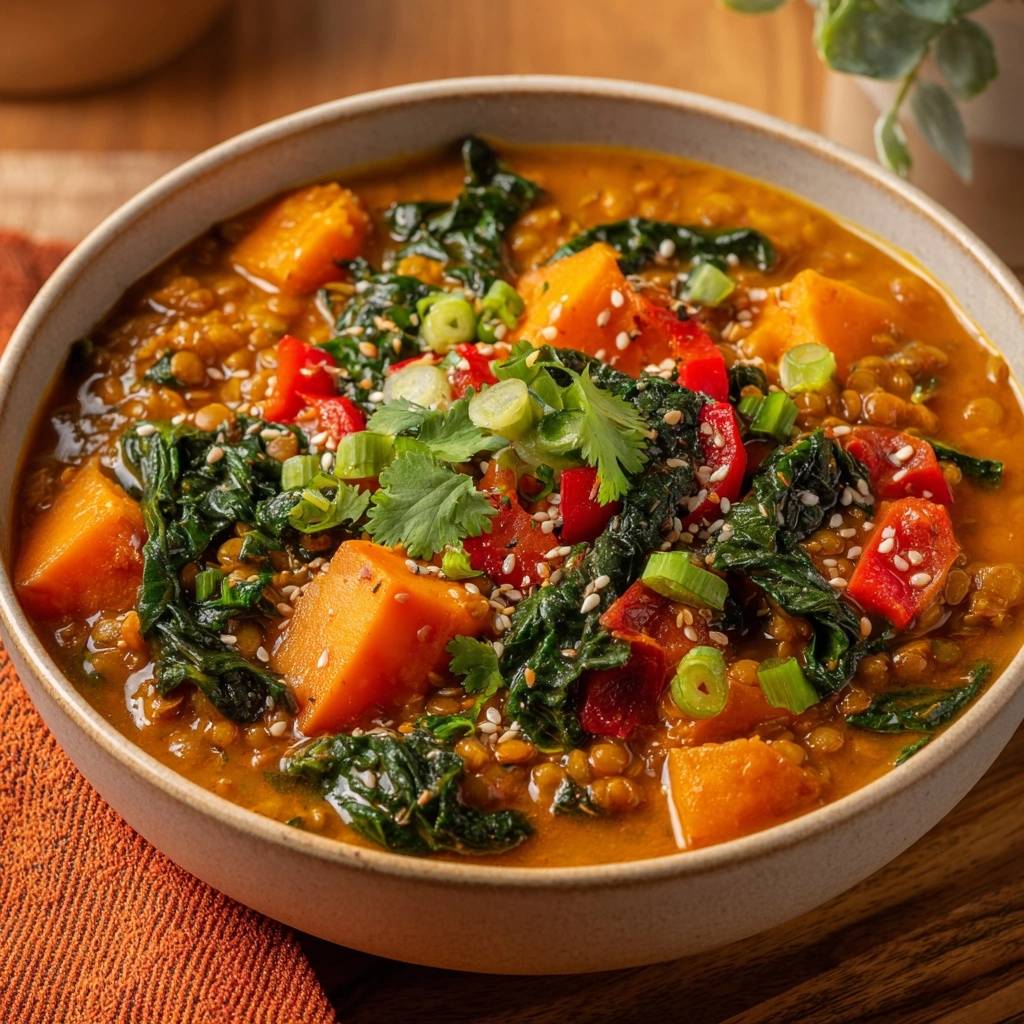 Stell dir vor, du tauchst deinen Löffel in eine goldgelbe, samtige Sauce, die nach Kokos und fernen Gewürzen duftet. Du beißt auf ein Stück Süßkartoffel, das perfekt gabelzart ist, aber nicht auf der Zunge zerfällt wie Babybrei.