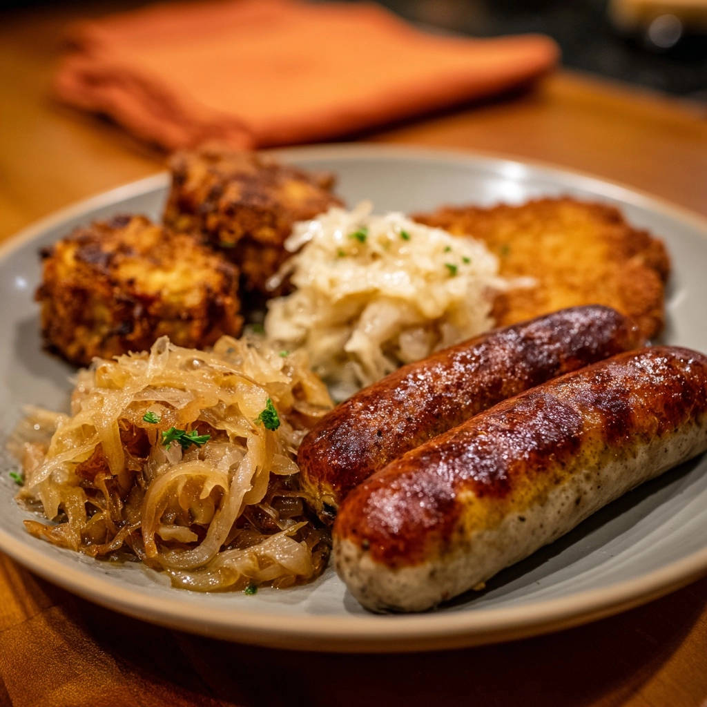 - Anrichten: Das frisch gebratene, knusprige Hähnchenschnitzel zusammen mit den Bratwürsten, den karamellisierten Zwiebeln und dem warmen Sauerkraut auf Tellern anrichten. Sofort servieren und genießen!