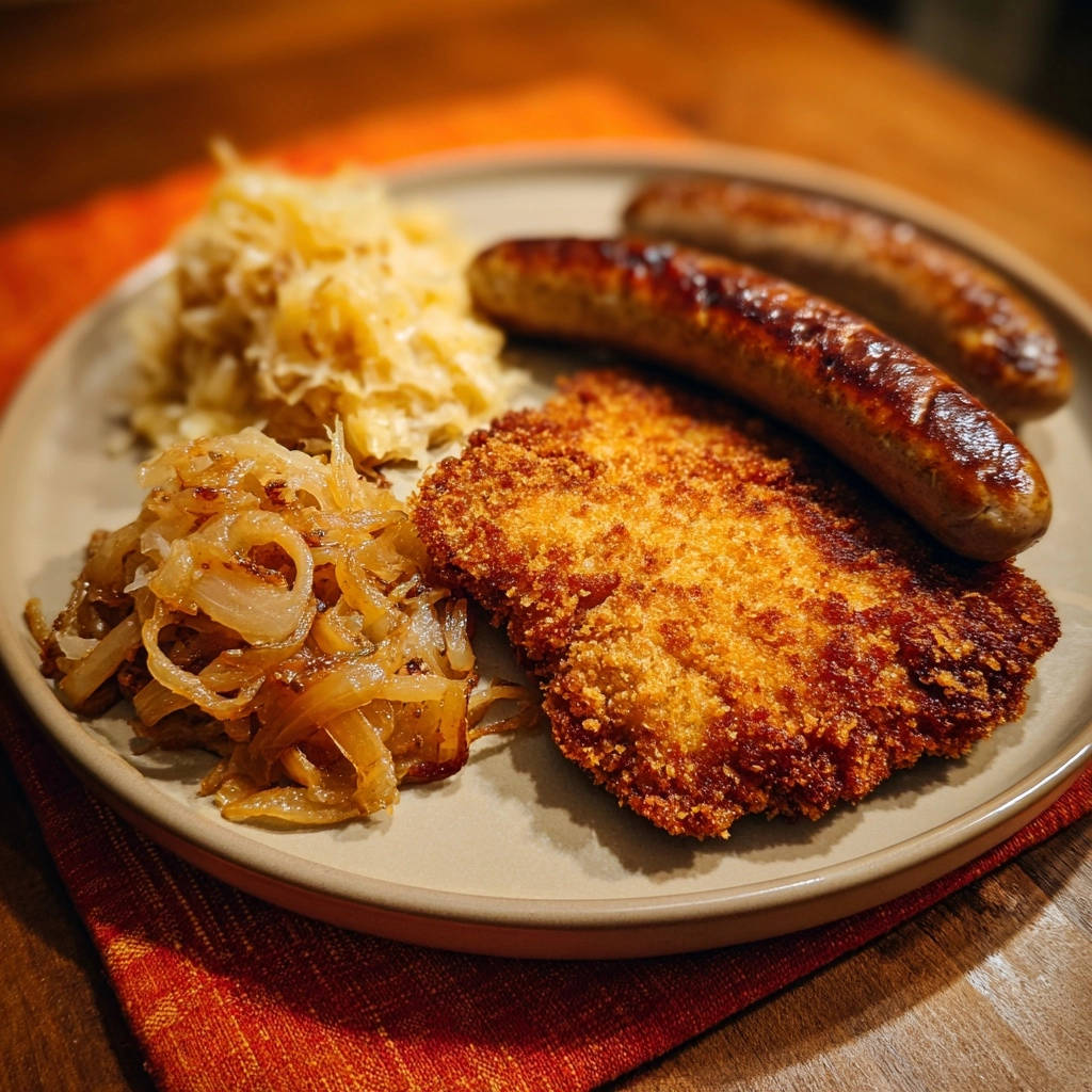 Deftige Hausmannskost: Knuspriges Schnitzel & Wurst mit Kraut – Perfekte Panade!